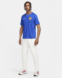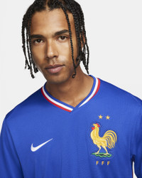 The FFF 2024 Home kit takes inspiration from classic France jerseys of the 1960s while also celebrating the vibrant and diverse culture of the country. An oversized Cockerel at the chest and the tri-color French flag ribbing leave no doubt which country this jersey represents. Product Details - "Nos differences nous unissent," meaning "Our differences unite us," on inside of jersey - 100% polyester - Machine wash - Imported - Shown: Bright Blue/University Red/White - Style: FJ1259-452 SIZE & FIT Model is wearing size M and is 6′2″188cm Standard fit: easy and traditional