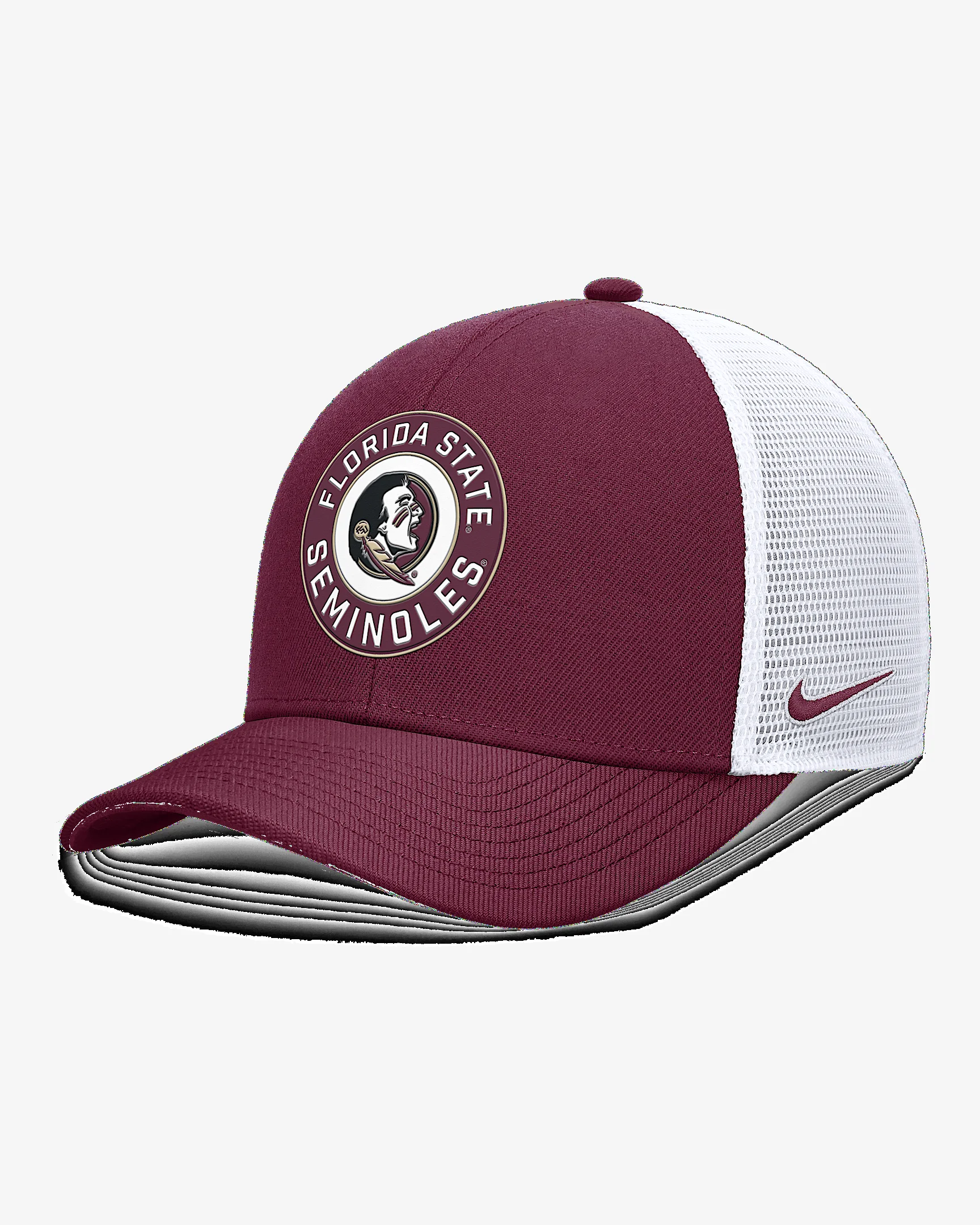 Featuring a 2-tone design and embroidered team details, the Primetime Rise Hat lets you effortlessly showcase support for Florida State. Its sweat-wicking technology and trucker construction with four mesh panels help provide a breathable, comfortable feel. Benefits - Nike Dri-FIT technology moves sweat away from your skin for quicker evaporation, helping you stay dry and comfortable. - Snapback closure provides a customizable fit. Product Details - 6-panel design - Embroidered eyelets - 100% polyester - Hand wash - Imported - Shown: Garnet - Style: NC1308H8FTN-6YR