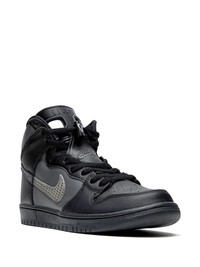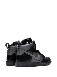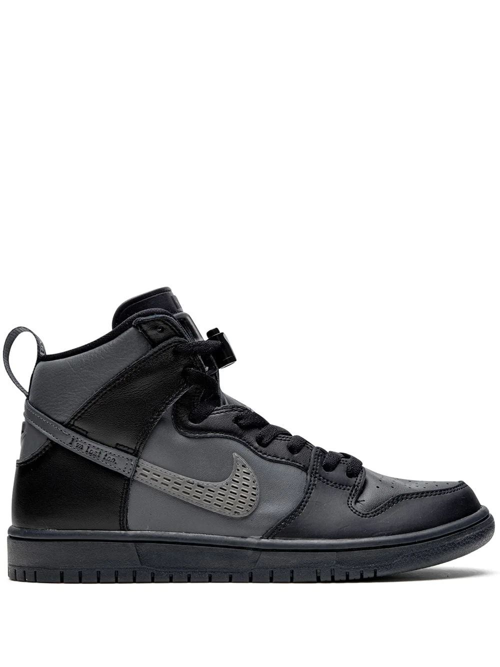 x FPAR SB Dunk High sneakers The FPAR x Nike SB Dunk High is a collaboration between the Forty Percent Against Rights streetwear label and Nike’s skateboarding footwear division. FPAR is one of a few Tetsu Nishiyama-headed Japanese streetwear imprints. Believing that any original artwork changed at least 40% no longer has its rights, the brand puts that notion on full display on the SB Dunk High. Charcoal grey and black leather panels comprise the entire upper. The tongue of the design is lifted off the Air Jordan 6 with Nike SB branding now appearing in place of “Air Jordan.” Netting covers the tonal Swoosh on the mid-panel with embroidered Nike SB branding covering the black leather lace throat. Completing the look of the unique Jordan-infused Dunk is a black rubber sole. The FPAR x Nike SB Dunk High was released on October 25, Imported Composition Calf Leather 100%
