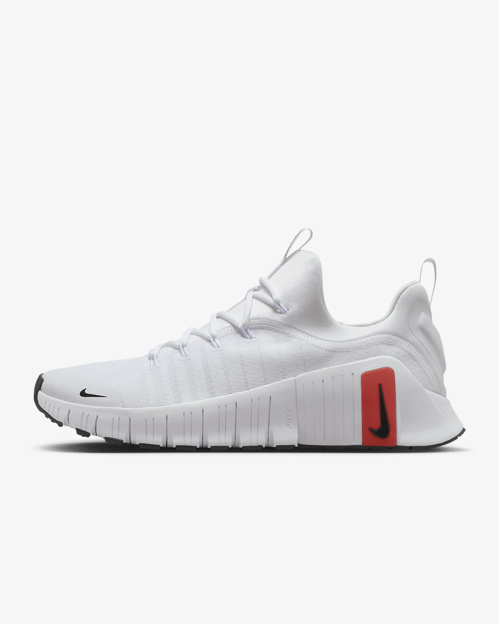 From power lifts to ladders, from grass blades to grainy platforms, from the turf to the track your workout has a certain purpose, a specific focus. The Free Metcon 6 supports every grunt, growl and “got it!” We added even more forefoot flexibility to our most adaptable trainer and reinforced the heel with extra foam. That means more freedom for dynamic movements during plyos and cardio classes, plus the stable base you need for weights. More Benefits - Multi-surface traction pattern is made for any workout surface and activity. - Comfortable inner sleeve increases ankle support and provides a more seamless fit. Product Details - Shown: White/Picante Red/Pure Platinum/Black - Style: FJ7127-100