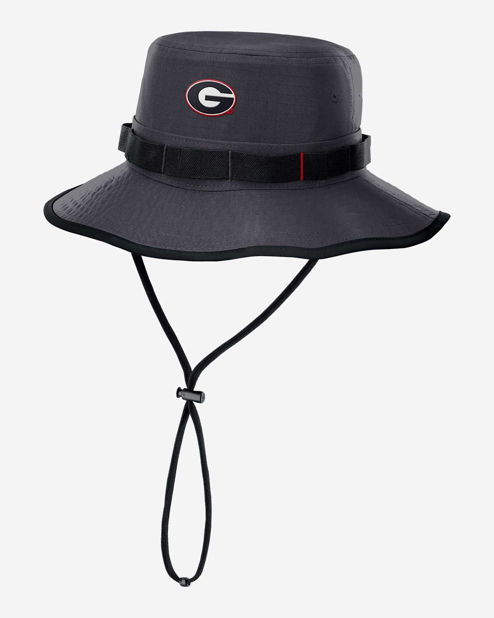 The Georgia Sideline Apex Gameday Boonie Hat is perfect for the outdoors with a classic bucket design and wraparound brim providing 360-degree coverage. It pairs durable ripstop fabric with sweat-wicking technology for a cool, dry accessory. Benefits - Nike Dri-FIT technology moves sweat away from your skin for quicker evaporation, helping you stay dry and comfortable. - Adjustable chin strap with toggle helps keep the hat secure and in place. Product Details - 100% polyester - Hand wash - Imported - Shown: Black - Style: NC1B466MNGB-CVH