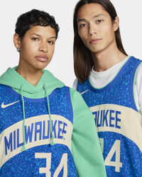 During the 2021 playoff run, Bucks fans flooded the Deer District to celebrate the team's first championship in 50 years. The inspiration for Milwaukee’s 2023/24 City Edition Jersey comes directly from its arena and the fans that make the neighborhood one of the best gathering places in the league. Product Details - Striped knit armhole and neckline taping - NBA logo, jock tag and logo design - 100% polyester - Machine wash - Imported - Shown: Photo Blue - Style: DX8766-406 SIZE & FIT Female model is wearing size 48 and is 5'7"170cm Male model is wearing size 52 and is 5'11"180cm Standard fit: easy and traditional If you typically wear men's styles, please select your usual size. If you typically wear women's styles, please size down.
