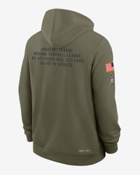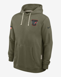 Featuring a military-inspired design, the Salute to Service Sideline Dominant Force Hoodie combines sweat-wicking technology with a soft fleece lining to help you comfortably support the Houston Texans and active or retired service members in cooler weather. Benefits - Nike Dri-FIT technology moves sweat away from your skin for quicker evaporation, helping you stay dry and comfortable. - Dolman sleeves help increase range of motion with a roomy fit under the arms. Product Details - Hood with drawstring - Front pocket - Zippered pocket at right side - 53% polyester/47% cotton - Machine wash - Imported - Shown: Olive - Style: 03AZ2DHA2D-D4V