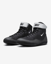 The Nike Inflict supports your moves on the mat with durable synthetic overlays down low and an adjustable ankle strap up top that helps secure your foot. Breathable mesh helps keep it cool through the heat of practice and your toughest matches. Rubber that wraps the sole gives you traction from all angles as you shoot and position yourself to dominate. Benefits - Lightweight mesh helps keep your foot cool. - Foam cushioning feels light and comfortable. - Shown: Black/White/Metallic Silver - Style: 325256-005