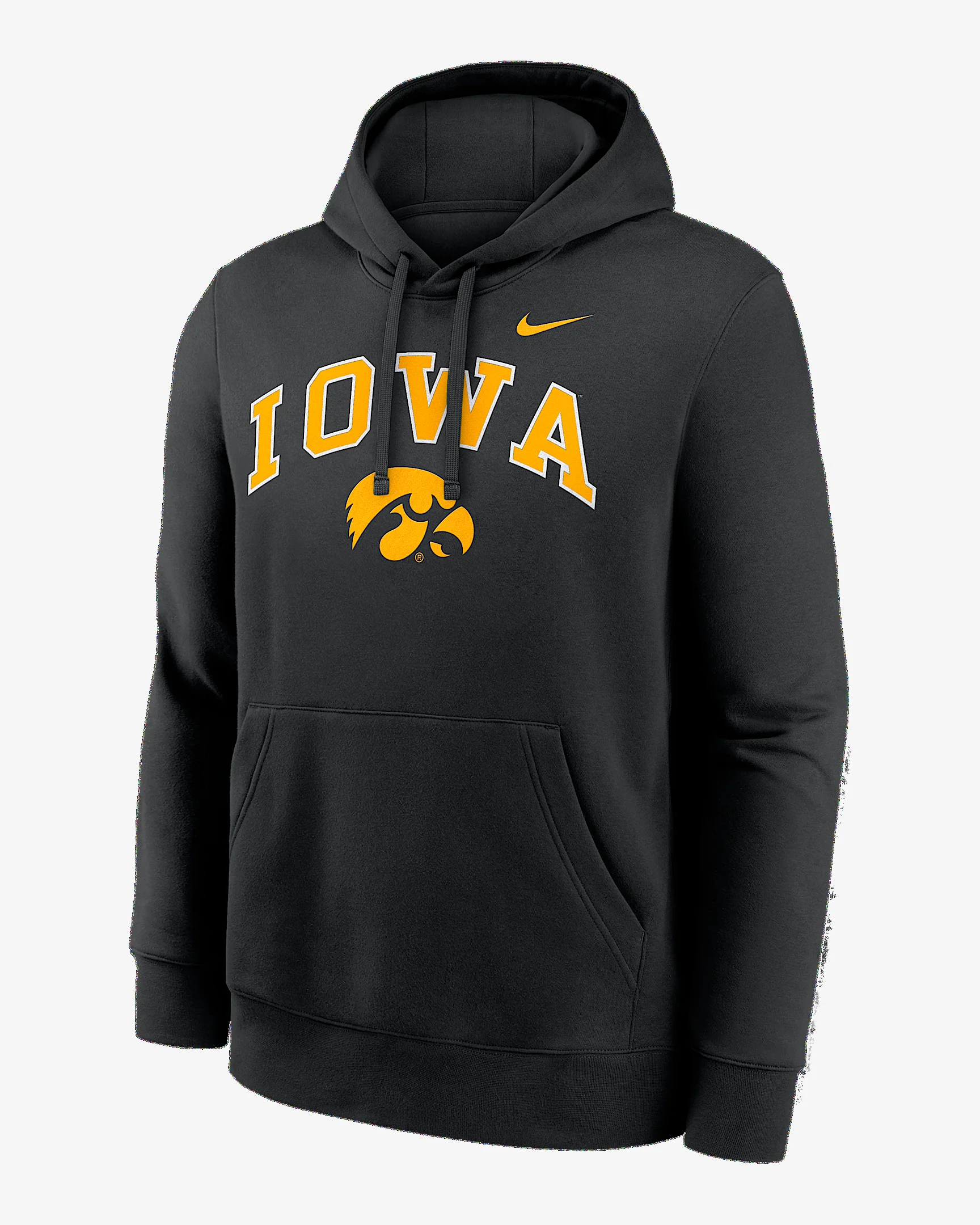 Featuring bold team graphics, this Arch Hoodie is made with cozy fleece fabric and a brushed French terry lining to help you comfortably support Iowa in chilly temperatures. Product Details - Front pocket - Hood with adjustable drawstring - 82% cotton/18% polyester - Machine wash - Imported - Shown: Black - Style: NKDK00AIA-Y48
