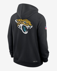This Jacksonville Jaguars Utility Player Sideline Hoodie combines sweat-wicking technology with a soft fleece lining to help create a warm, comfortable feel in cold temps. Benefits - Nike Dri-FIT technology moves sweat away from your skin for quicker evaporation, helping you stay dry and comfortable. - Dolman sleeves help increase range of motion with a roomy fit under the arms. Product Details - Hood with drawstring - Front pocket - Zippered pocket at right side - 53% polyester/47% cotton - Machine wash - Imported - Shown: Black - Style: 03AV00A9N-2FB
