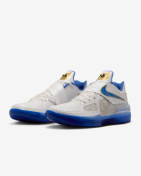 The KD 4 brings a lightweight, low-profile build made of smooth synthetic leather and airy textiles. Its signature wrap-around strap adds containment while forefoot Air Zoom cushioning provides speed, control and bounce. Benefits - Synthetic leather and textile upper is breathable and durable. - Hook-and-loop strap wraps around the midfoot for containment. - Snappy and responsive, Air Zoom cushioning helps provide a quick-off-the-ground sensation. - Rubber outsole gives you excellent grip. Product Details - Shown: Summit White/Metallic Gold/Bright Spruce/Hyper Royal - Style: IB3546-100
