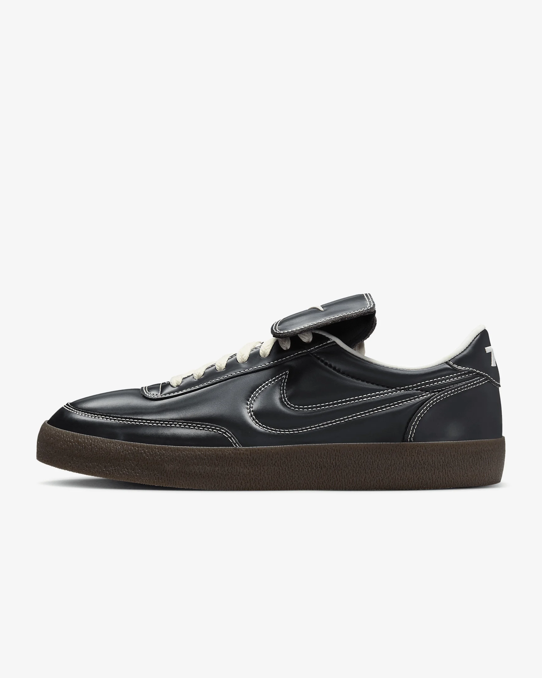 Inspired by the original low-profile tennis shoes, this Nike Killshot 2 upgrade uses glossy synthetic leather and detachable fold-over tongue flaps to create a fresh take on an old-school look. And it wouldn't be a "tennis" shoe without the rubber sole's reliable traction. Benefits - Embroidered 72 logo on the heel and the gum rubber sole add to the retro look. - Padded, low-cut collar looks sleek and feels great. Product Details - Shown: Black/Sail/Baroque Brown/Black - Style: HQ3489-010