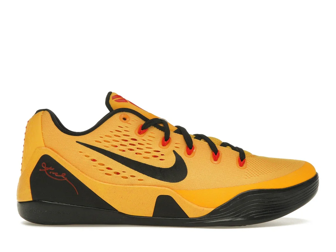 Kobe Bryant talked about the profound impact Bruce Lee had on him early and often throughout his NBA career. It's why it wasn't a surprise to see the Nike Kobe 9 EM Low Bruce Lee surface when Nike released a low-top version of Kobe's ninth signature shoe in 2014. This Kobe 9 sneaker featured an engineered mesh upper that was done up in a gorgeous gold color. It also had small hits of red on the tongue, eyelets, and midsole. The rest of the shoe, including the Swooshes, outsole, and heel, were covered in black to complete the look. The simple fact that Nike and Kobe went through with creating a Bruce Lee-inspired Kobe 9 in the first place was the coolest part about this sneaker to us. It no doubt helped introduce lots of Kobe fans to Bruce Lee and his incredible body of work. The Nike Kobe 9 EM Low Bruce Lee was released on March 29th, 2014, when it retailed for $160. - Style 646701-700 - Colorway University Gold/Black-Laser Crimson - Retail Price 160 - Release Date 2014-03-29 - Featured false - Product Line Nike Kobe