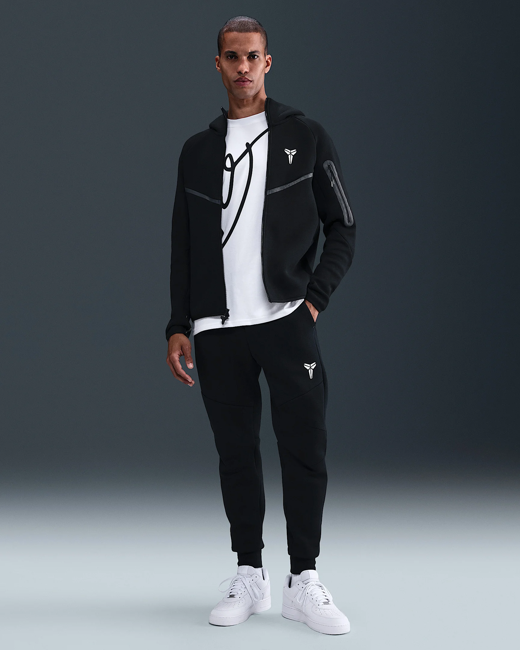 Nike’s signature Tech Fleece meets Kobe’s relentless spirit. These smooth knit pants remind you to always chase greatness, on and off the court. More Benefits - Side pockets and a vertical zippered pocket at the hip help keep your essentials secure. - The standard fit feels relaxed through the seat and thighs with a slight taper at the ankle. - Articulation at the knee allows ease of movement while serving a distinct Nike Tech aesthetic. Product Details - Ribbed cuffs - 53% cotton/47% polyester - Machine wash - Imported - Shown: Black/White - Style: IB2716-010 SIZE & FIT Standard fit: easy and traditional