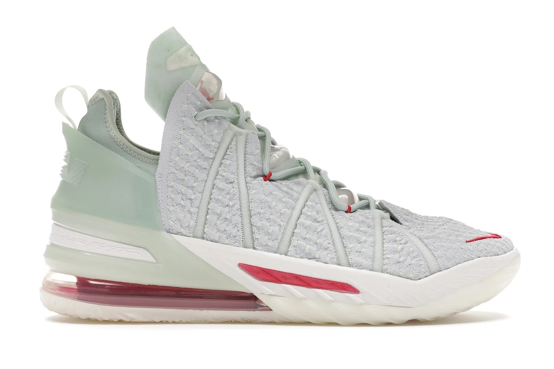 The Nike LeBron 18 Empire Jade showcases a fusion of materials, featuring light jade uppers highlighted with red accents throughout. Inspired by a jade seal, the Nike LeBron 18 Empire Jade’s predominant light-green hue is amplified by diverse materials such as the high-tech Knitposite 2.0 fabric, ballistic nylon, and rubber overlays. Semi-translucent bubbles embellish the geometric tongue, and a red mini-Swoosh is intricately embroidered near the toecap, accompanied by subtle red accents near the eyelets. The rear quarter boasts a jade-colored finish, all perched atop an articulated midsole housing a full-length Zoom Air unit. This innovative cushioning technology ensures exceptional energy return. The feature we like about the Nike LeBron 18 Empire Jade is its pioneering cushioning technology. This technology not only ensures remarkable comfort and support but also significantly boosts the shoe's performance, positioning it as a top-notch choice. The sneaker originally sold for $200 when it was released on September 21, 2020. - Style DB7644-002 - Colorway White/Jade Ice-Red - Retail Price 200 - Release Date 2020-09-21 - Featured false - Product Line Nike LeBron
