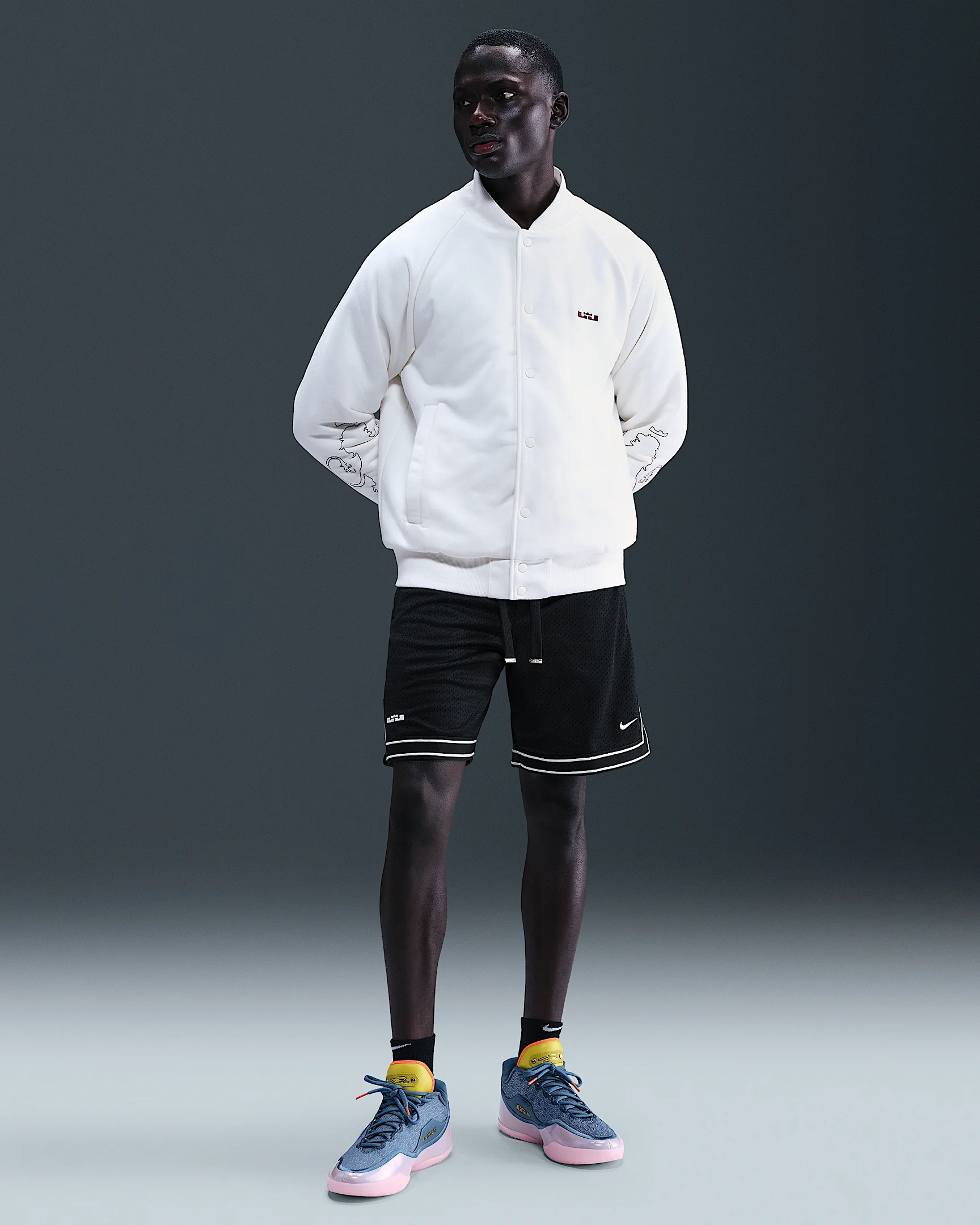Celebrate LeBron’s reign with these 8” basketball shorts. Two layers of structured mesh bring a premium feel, and a “Forever King” label pays tribute to his long-standing dominance of the court. Benefits - Double-layered heavyweight mesh has a durable and breathable feel. - Drawcord tips highlight LeBron's jersey numbers, plus "LBJ" and crown logos. - Zippered pockets securely store your essentials. Product Details - 8" inseam - Elastic waistband with flat drawcord - Embroidered Swoosh logo - Embroidered LeBron crown logo - Body/Lining: 100% polyester - Machine wash - Imported - Shown: Black/Sail - Style: HV3394-010 SIZE & FIT Model is wearing size M and is 6′1″184cm Standard fit: easy and traditional
