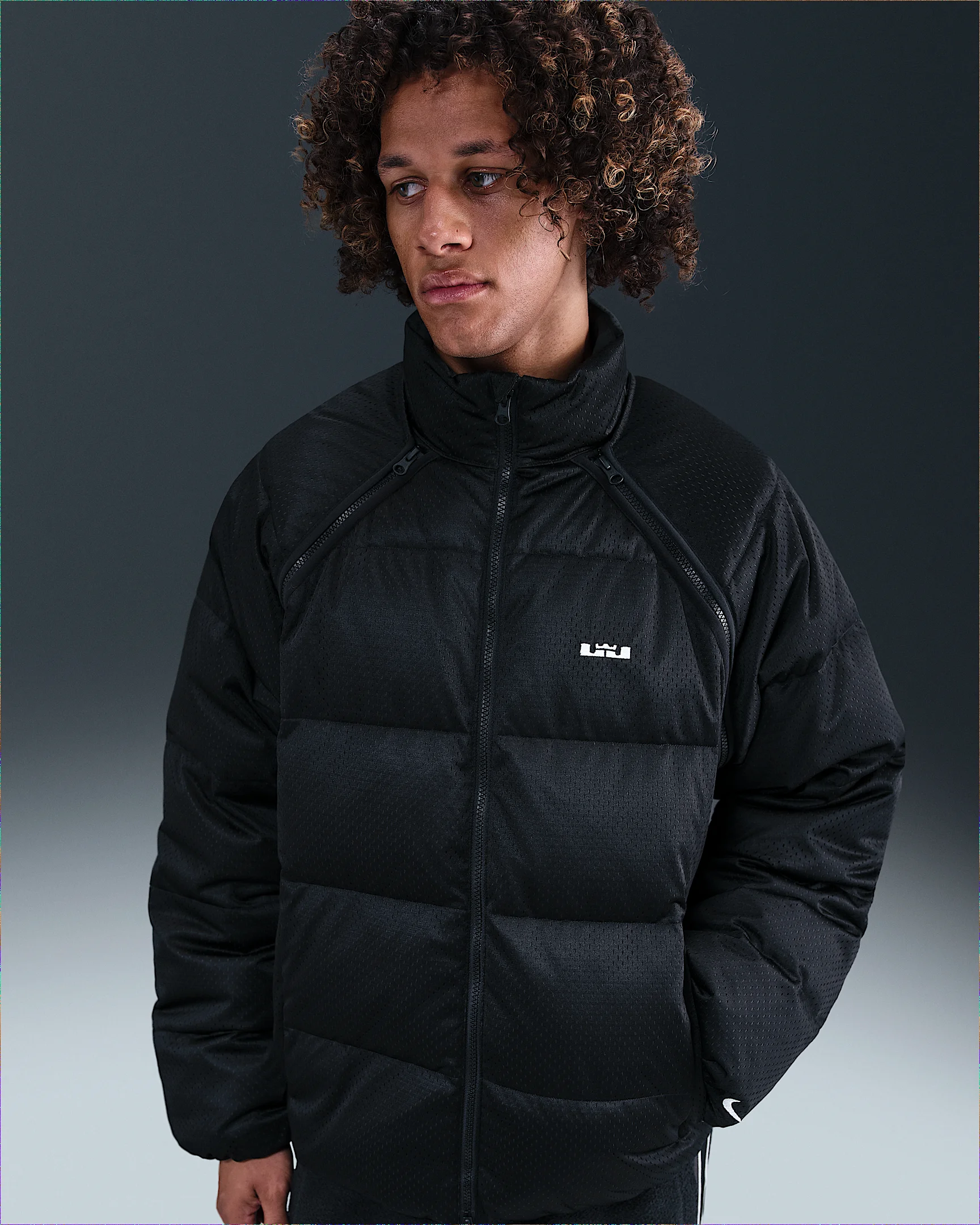 As versatile as The King’s game, this down jacket adapts to ever-changing conditions. Benefits - Nike Therma-FIT ADV technology combines heat-regulating fabric with advanced engineering and features to help keep you warm in cold-weather conditions. - Lightweight down insulation keeps you warm without weighing you down. - Mesh shell gives basketball-inspired style. Product Details - Two-way full-length zipper - Zippered pockets - Embroidered LBJ crown logo - Embroidered Swoosh logos - Body/Lining: 100% polyester. Fill: grey duck down (Minimum 85% Down)/(APA Version: 85% Grey Duck Down/15% Feathers). - Machine wash - Imported - Shown: Black/Sail - Style: HV3501-010 SIZE & FIT Standard fit: easy and traditional
