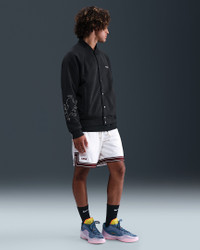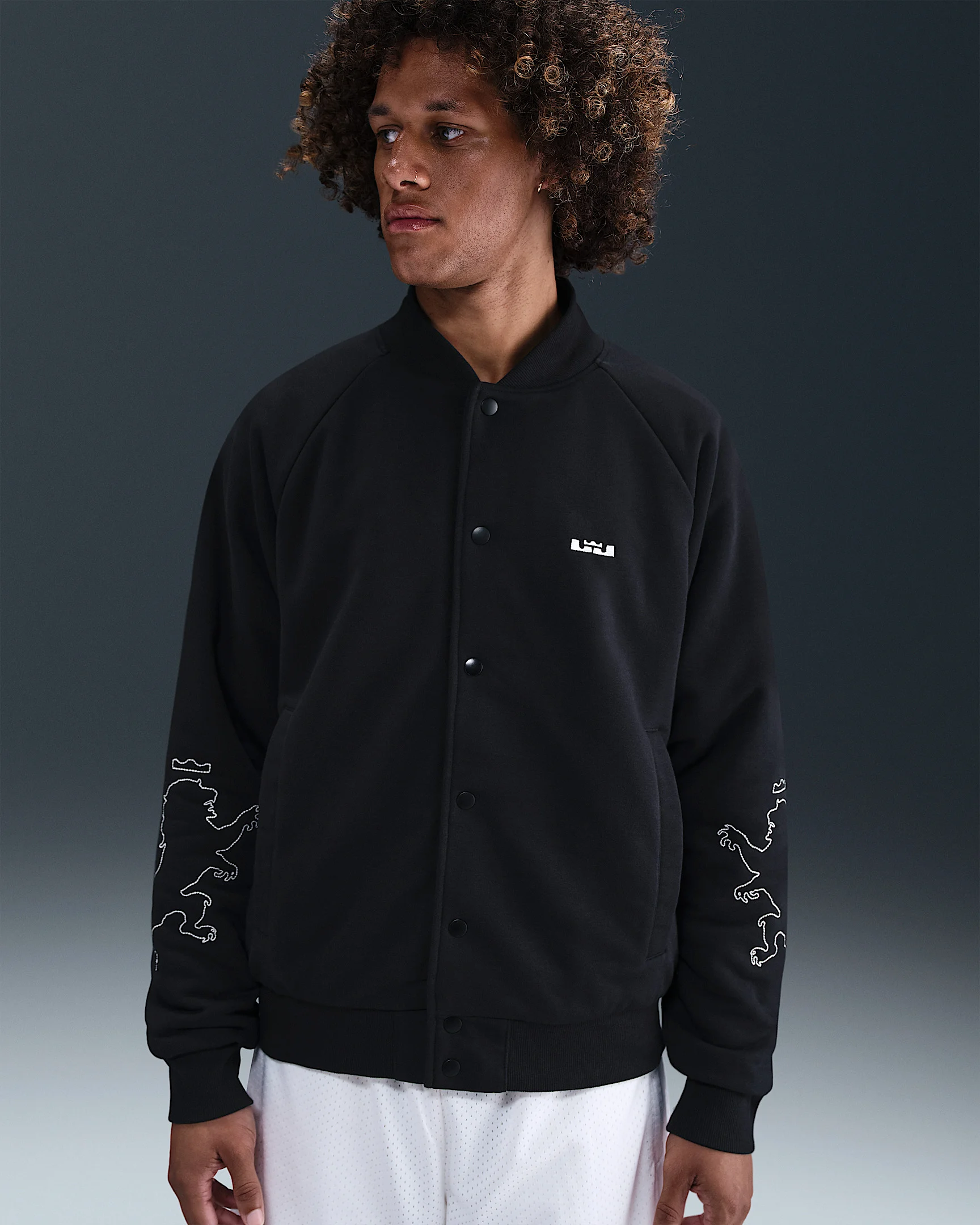 This premium Therma-FIT jacket celebrates LeBron’s reign that’s stood the test of time. Built for cold weather, it combines performance fleece and quilted synthetic insulation for unmatched warmth worthy of basketball royalty. Product Details - Snap-button front closure - Welted hand pockets - Ribbed collar, cuffs and hem - Body: 54% polyester/46% cotton. Rib: 96% cotton/4% spandex. Lining/Fill: 100% polyester. - Machine wash - Imported - Shown: Black/Sail/Black - Style: HV3498-010 SIZE & FIT Model is wearing size M and is 6′2″188cm Standard fit: easy and traditional