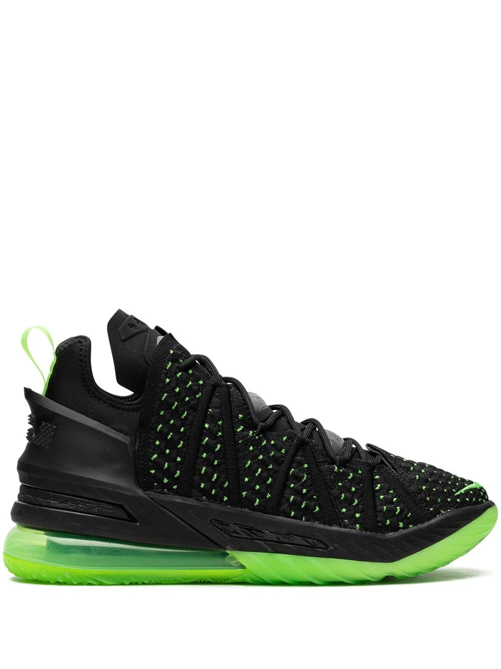 Lebron XVIII "Electric Green" sneakers As the name suggests, these Lebron XVIII are the basketball star’s 18th mainline signature sneaker with Nike. The knitted uppers are flecked with “Electric Green” speckles to match the soles and pull tabs and reinforced with heat-moulded panels and webbing harnesses for a secure fit. Visible Max Air cushioning is shaped to follow where your foot hits the court. Highlights - Black - Neon green - Speckle knit - Signature swoosh logo detail - Round toe - Front lace-up fastening - Pull-tab at the heel - Contrasting heel counter - Branded insole - Rubber sole with max air cushioning - These styles are supplied by a premium sneaker marketplace. stocking only the most sought-after footwear, they source and curate some of the most hard to find sneakers from around the world. Imported Composition Sole: Rubber 100% Outer: Fabric 100% Lining: Fabric 100%