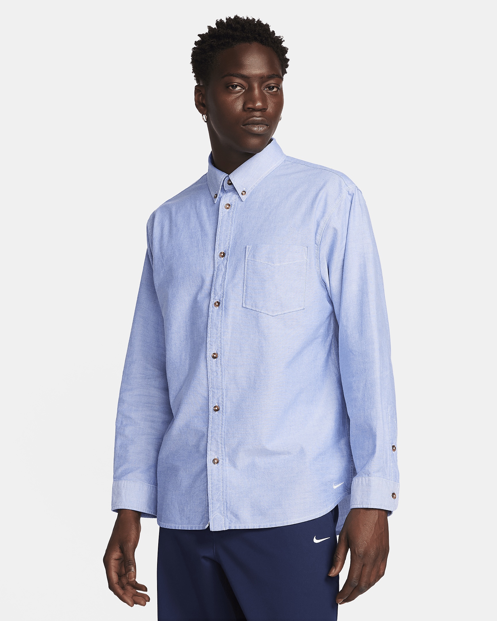 A classic Oxford made with soft, breathable chambray fabric, this button-down shirt from our Nike Life collection gives you a high-quality piece to pair up with your favorite jeans, shorts or chinos. The full-length placket and button-down collar let you keep your look polished. Plus, it's designed to feel roomy through the shoulders and body for easy comfort and layering. Product Details - Chest pocket - Button-down collar - Button cuffs - Box pleat and locker loop on back - Nike Life woven label of quality on inner back - 100% cotton - Machine wash - Imported - Shown: White/Game Royal/Football Grey - Style: FN3125-101 SIZE & FIT Loose fit: roomy and relaxed