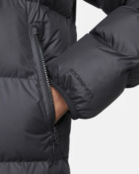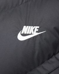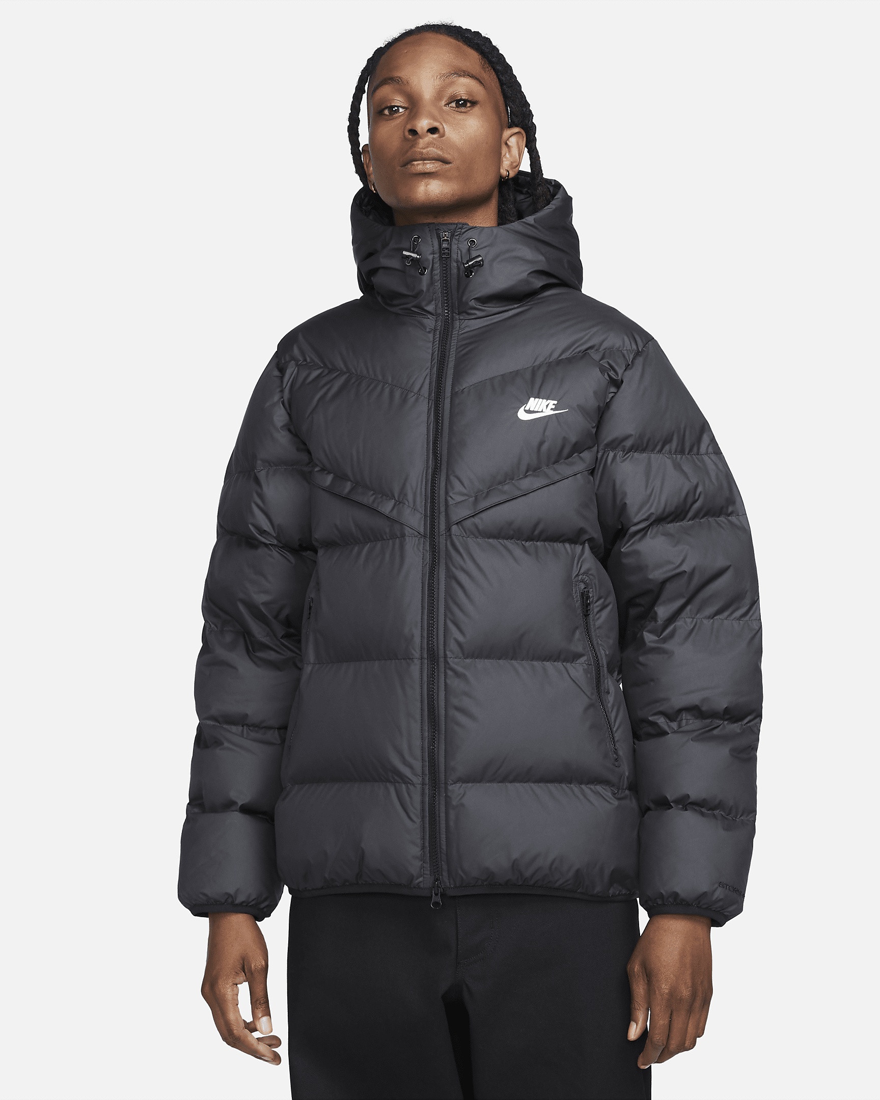 Rock the iconic look of the Windrunner while you brave the cold in this toasty hooded jacket. It takes the classic puffer look and backs it up with the insulating power of PrimaLoft® Thermoplume insulation. Nike Storm-FIT technology resists elements like wind and water to help keep you comfortable in harsh weather conditions. A relaxed fit gives you some room to layer up underneath for those extra chilly days. More Benefits - Style: Standard-fit Windrunner puffer jacket - Materials: Water-repellent and windproof woven fabric, with color blocking on select colorways - Construction: Superwarm PrimaLoft insulation with smooth taffeta lining - Storage: Zippered side pockets - Trim: 2-way front zipper; elastic cuffs and hem; bungee-adjustable hood - Other Features: Full-length storm flap over front zipper Product Details - Embroidered Nike Futura logo at left chest - Body/Lining/Fill: 100% polyester. - Machine wash - Imported - Shown: Black/Black/Sail - Style: FB8185-010 SIZE & FIT Model is wearing size M and is 6′1″185cm Standard fit: easy and traditional