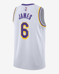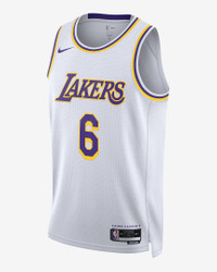 With a white background, the Association Edition Jersey is a common thread shared by every team in the NBA. This Los Angeles Lakers jersey is inspired by what the pros wear on the hardwood, from team colors and graphics to lightweight, sweat-wicking mesh. It helps keep you dry and cool on or off the court while you rep your favorite player and the game you love. Benefits - Nike Dri-FIT technology moves sweat away from your skin for quicker evaporation, helping you stay dry and comfortable. - Breathable mesh helps keep you cool on or off the court. Product Details - Twill player name and number - Heat-applied graphics - Jock tag at hem - 100% polyester - Machine wash - Imported - Shown: White - Style: DN2081-100 SIZE & FIT Standard fit: easy and traditional If you typically wear men's styles, please select your usual size. If you typically wear women's styles, please size down.