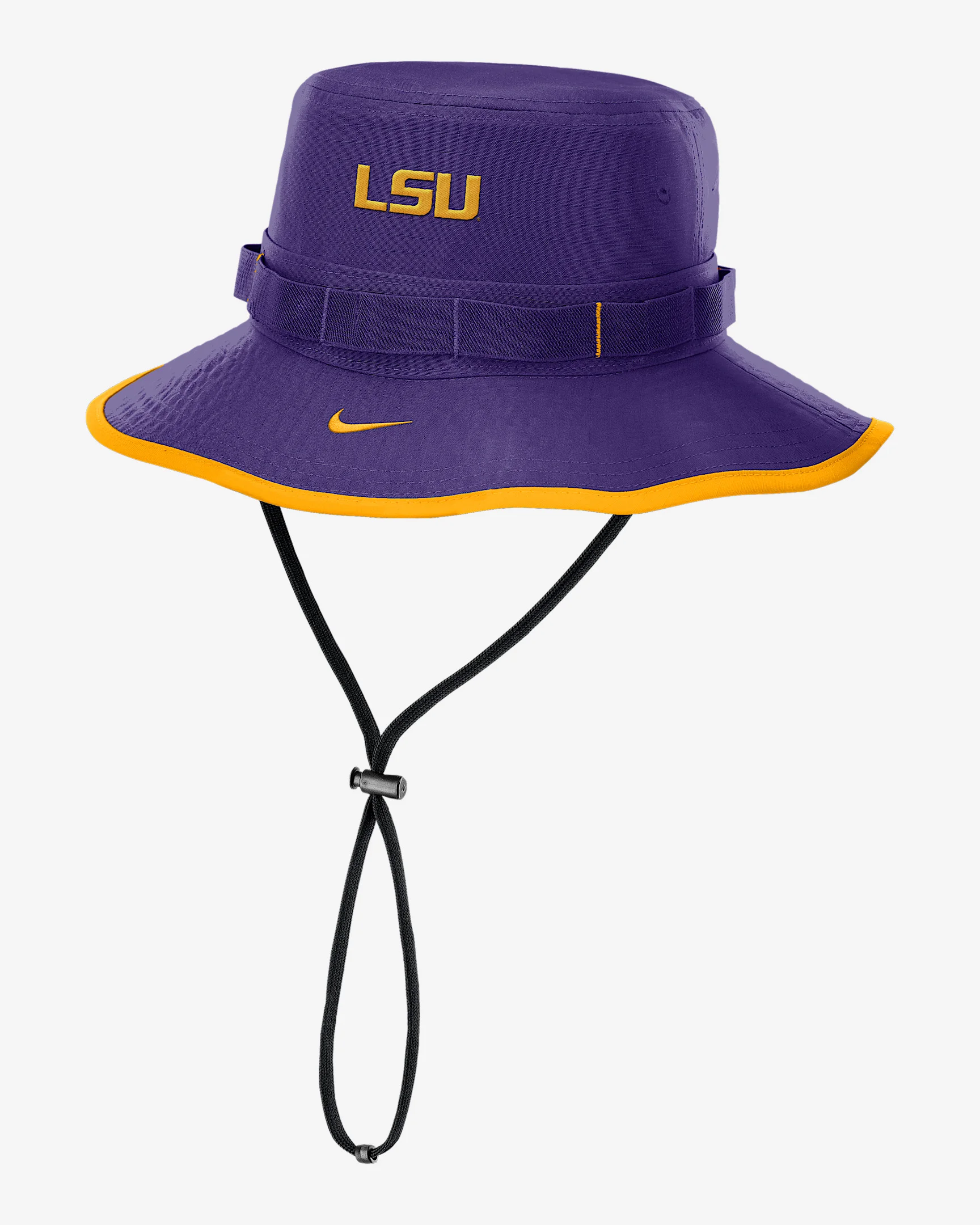 The LSU Tigers On-Field Apex Boonie Hat is perfect for the outdoors with a classic bucket design and wraparound brim providing 360-degree coverage. It pairs durable ripstop fabric with sweat-wicking technology for a cool, dry accessory. Benefits - Nike Dri-FIT technology moves sweat away from your skin for quicker evaporation, helping you stay dry and comfortable. - Adjustable chin strap with toggle helps keep the hat secure and in place. Product Details - 100% polyester - Hand wash - Imported - Shown: Purple - Style: NC1B51LLSN-NF0