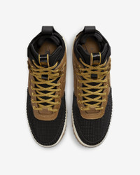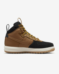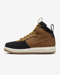 When it's colder than the far side of the moon and spitting rain too, you still got to look good. From water-repellent leather to a rugged outsole, the Lunar Force 1 adapts AF1 style so you can keep your flame burning when the weather hits. Metal lace hardware and extended tongue bring mountain boot toughness, while the star studded toe design gives your look the edge. Benefits - Durable leather is easily cleanable so you can keep your look fresh. - Water-repellent finish and internal membrane help keep your feet dry. - Toe piece with star pattern adds durability. - Synthetic insulation helps keep you warm. - Originally designed for performance hoops, the Air unit delivers lightweight cushioning. - Plush tongue wraps over the ankle to help keep out the moisture and cold. - Rubber outsole with aggressive traction pattern adds durable grip. Product Details - Not intended for use as Personal Protective Equipment (PPE) - Shown: Ale Brown/Black/Goldtone/Ale Brown - Style: 805899-202
