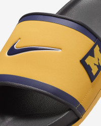 Rep the Wolverines all the way down to your feet in these Michigan slides. A cushioned synthetic leather strap features your school’s logo, while an innovative foam midsole makes this slide so comfy, you’ll never want to take it off. Benefits - Contoured footbed cradles your foot while the dual-density foam adds cushioning and stability. - Soft, plush fabric lines the synthetic leather strap to add comfort. Product Details - Shown: Amarillo/Dark Smoke Grey/College Navy - Style: FN4297-700