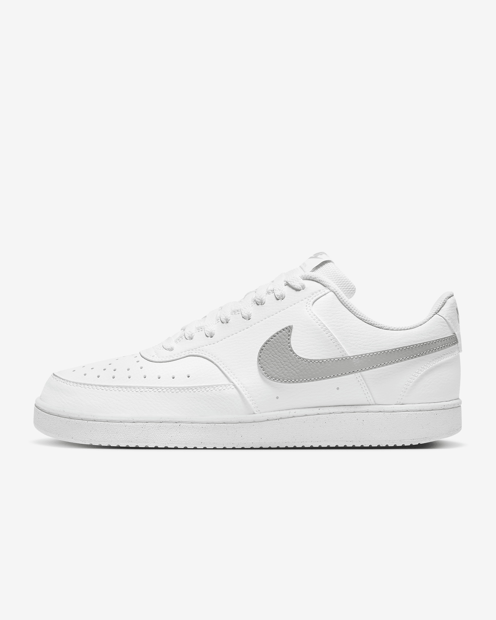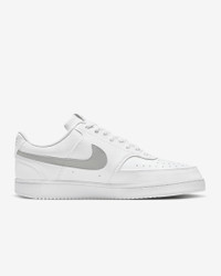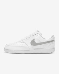 In love with the classic look of '80s basketball but have a thing for the fast-paced culture of today's game? Meet the Nike Court Vision Low. A classic remixed with at least 20% recycled materials by weight, its crisp upper and stitched overlays keep the soul of the original style. The plush, low-cut collar keeps it sleek and comfortable for your world. Benefits - Made with at least 20% recycled material by weight. - Whenever you see the Nike Sunburst or the name Next Nature (NN), you see one more step on our journey toward zero carbon and zero waste. - Using synthetic materials, the design features materials that echo mid-1980s basketball shoes. - Padded, low-cut collar looks sleek and feels great while the perforations on the toe and sides add comfort and breathability. Product Details - Perforations on the toe and sides - Rubber outsole - Shown: White/White/Light Smoke Grey - Style: DH2987-112 SIZE & FIT Fits large; we recommend ordering a half size down