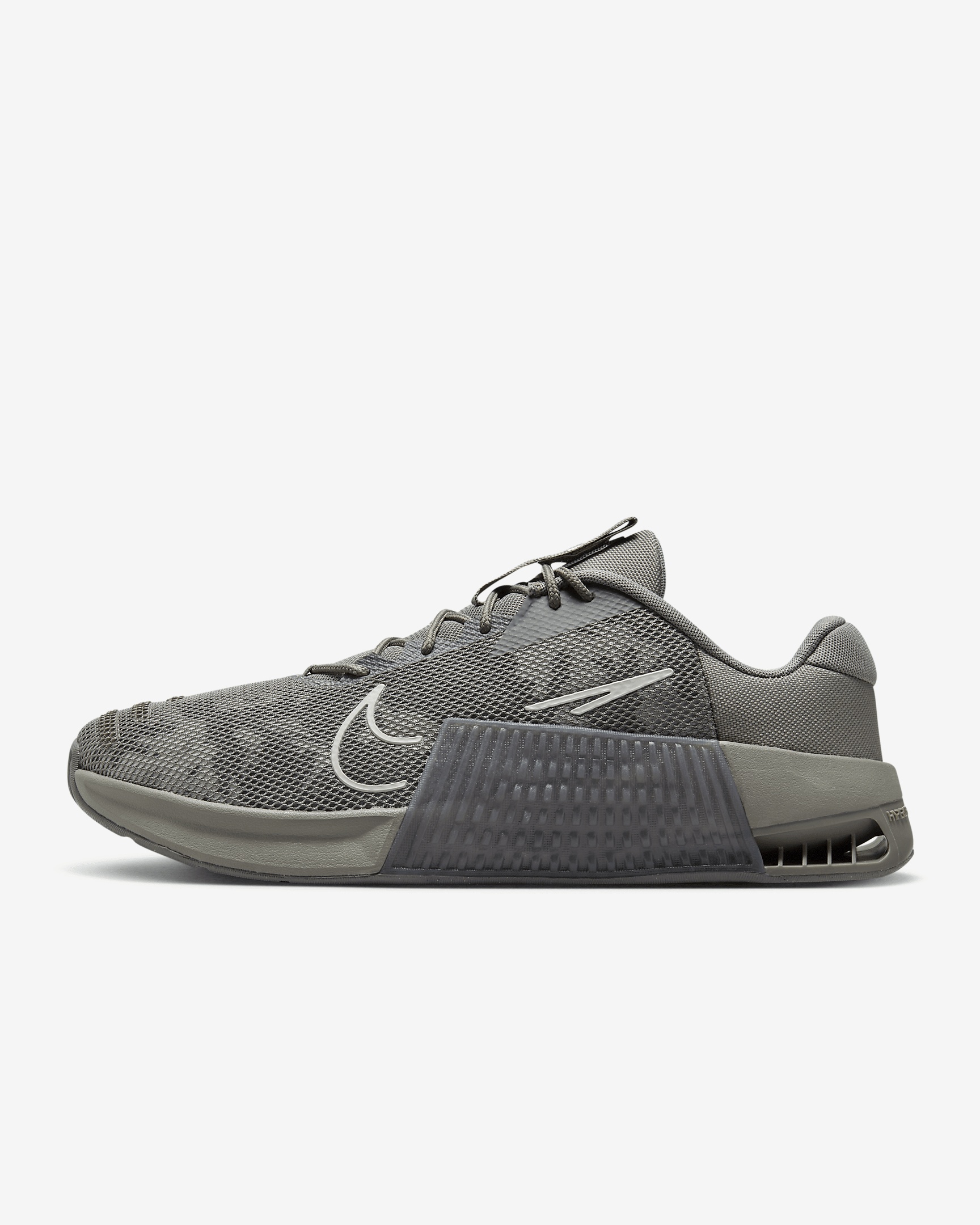 Whatever your "why" is for working out, the Metcon 9 makes it all worth it. We improved on the 8 with a larger Hyperlift plate and added rubber rope wrap. Sworn by some of the greatest athletes in the world, intended for lifters, cross trainers, go-getters and it’s still the gold standard that delivers day after day. More Benefits - Full rubber outsole provides durable traction for dynamic movements like cleans and walking lunges. - Breathable textile has a haptic print, which creates a 3-D effect that adds durability and texture, helping make it easier to keep your shoes clean. Also, it sports flexible, durable support in the toe area, so that when your toes splay when lifting heavy weights, it won’t feel restrictive. Product Details - Shown: Dark Stucco/Flat Pewter/Phantom/Light Bone - Style: DZ2616-008