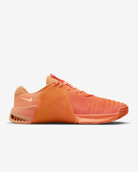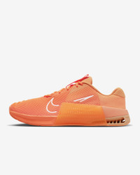 Whatever your "why" is for working out, the Metcon 9 makes it all worth it. We improved on the 8 with a larger Hyperlift plate and added rubber rope wrap. Sworn by some of the greatest athletes in the world, intended for lifters, cross trainers, go-getters and it’s still the gold standard that delivers day after day. More Benefits - Full rubber outsole provides durable traction for dynamic movements like cleans and walking lunges. - Breathable textile has a haptic print, which creates a 3-D effect that adds durability and texture, helping make it easier to keep your shoes clean. Also, it sports flexible, durable support in the toe area, so that when your toes splay when lifting heavy weights, it won’t feel restrictive. Product Details - Shown: Atomic Orange/Ice Peach/Peach Cream/White - Style: DZ2616-800