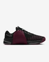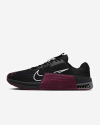 Whatever your "why" is for working out, the Metcon 9 makes it all worth it, with a larger Hyperlift plate, added rubber rope wrap and updated foam. Sworn by some of the greatest athletes in the world, intended for lifters, trainers, go-getters, it’s still the gold standard that delivers day after day. More Benefits - Full rubber outsole provides durable traction for dynamic movements like cleans and walking lunges. - Breathable textile has a haptic print, which creates a 3-D effect that adds durability and texture and helps make it easier to keep your shoes clean. Product Details - Shown: Black/Team Maroon/Smoke Grey/White - Style: FD5431-014