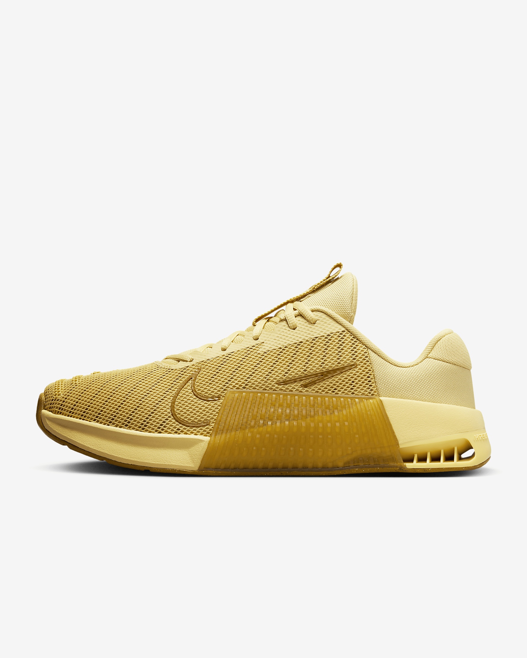 Whatever your "why" is for working out, the Metcon 9 makes it all worth it. We improved on the 8 with a larger Hyperlift plate and added rubber rope wrap. Sworn by some of the greatest athletes in the world, intended for lifters, cross trainers, go-getters and it’s still the gold standard that delivers day after day. More Benefits - Full rubber outsole provides durable traction for dynamic movements like cleans and walking lunges. - Breathable textile has a haptic print, which creates a 3-D effect that adds durability and texture, helping make it easier to keep your shoes clean. Also, it sports flexible, durable support in the toe area, so that when your toes splay when lifting heavy weights, it won’t feel restrictive. Product Details - Shown: Saturn Gold/Bronzine - Style: DZ2617-700