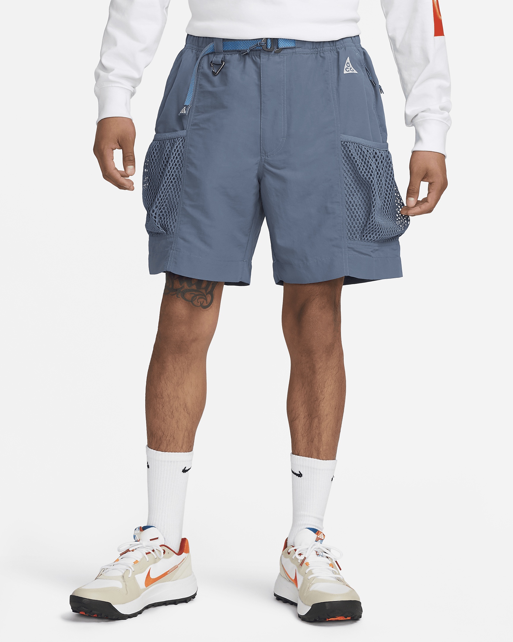 Keep taking your outdoor journey to new horizons in the mid-weight feel of our Nike ACG "Snowgrass" shorts. Made with breathable, water-repellant fabric, they have an adjustable belt and plenty of secure pockets for holding all your outdoor essentials. The roomy fit is designed to give you some comfortable space through the seat and thighs for easy movement on and off the trail. Product Details - Embroidered ACG logo - Body: 100% nylon. Side Pockets/Mesh: 100% Polyester. - Machine wash - Imported - Shown: Diffused Blue/Summit White - Style: DV9405-491 SIZE & FIT Model is wearing size M and is 6′1″185cm Loose fit: roomy and relaxed
