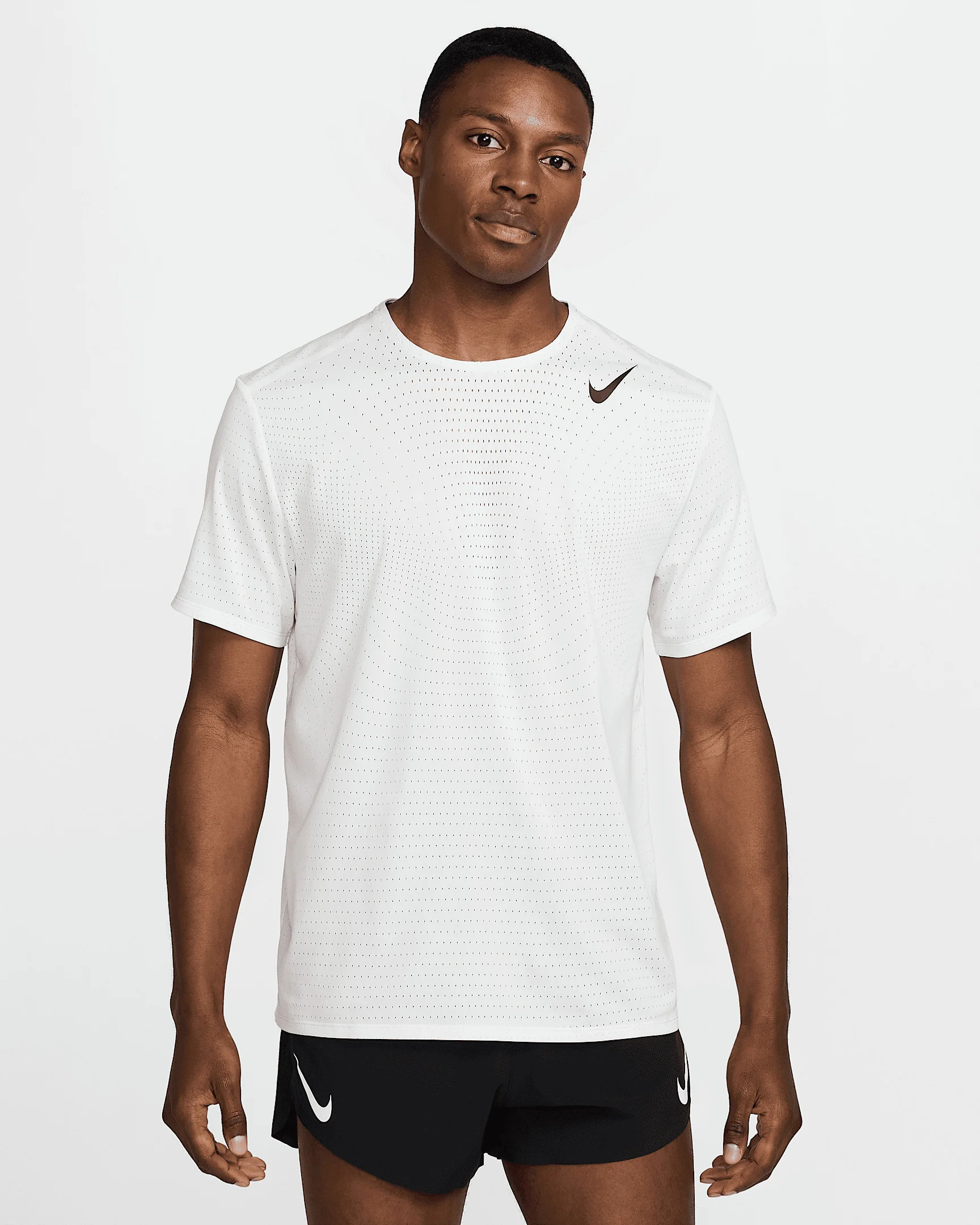 Built for speed, the AeroSwift collection is our pinnacle racing gear. This sweat-wicking engineered-knit top is lightweight and ultra-breathable to help keep you cool through the finish line. Benefits - Nike Dri-FIT ADV technology combines moisture-wicking fabric with advanced engineering and features to help you stay dry and comfortable. - Engineered knit fabric is lightweight and breathable. - Bonded seams at the shoulder reduce bulk for a lighter feel. - Swoosh logos have a non-reflective finish that won't catch flash photography during the race. Product Details - 100% polyester - Machine wash - Imported - Shown: Summit White/Black - Style: HJ3377-121 SIZE & FIT Model is wearing size M and is 6′0″183cm Standard fit: easy and traditional