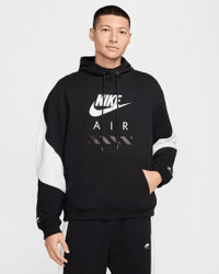 This roomy hoodie is constructed with a heavyweight fleece that feels worn in from day one. The scuba hood has soft jersey lining and binding at the edges for improved structure. Benefits - Designed to feel roomy through the body for easy movement and layering. - Binding around the hood adds structure and a scuba neck adds extra coverage. Product Details - Nike Air jock tag and silicone patch - Metal grommets and drawcord tips - Body: 100% cotton. Rib: 96% cotton/4% spandex. Hood lining: 100% cotton. - Machine wash - Imported - Shown: Black/White/White - Style: HJ0273-010 SIZE & FIT Model is wearing size M and is 6′1″185cm Big & Tall model is wearing size 3XL and is 6'5"196cm Loose fit: roomy and relaxed