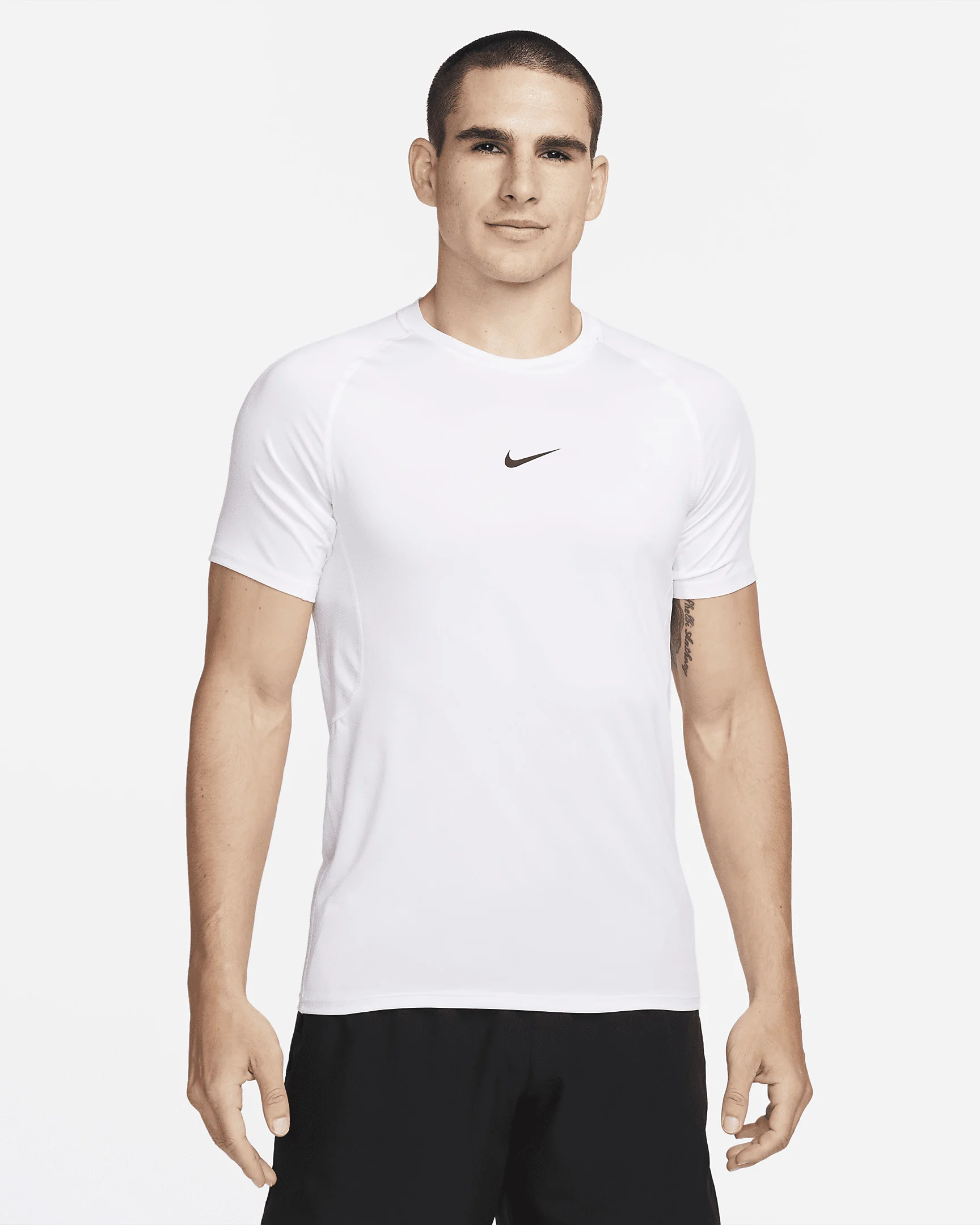 The Nike Pro collection is all about feeling confident in trying your best no matter where you are on your exercise journey. This slim-fitting top has a smooth and stretchy feel for the sports and activities that you love. Nike Dri-FIT technology moves sweat away from your skin for quicker evaporation, helping you stay dry and comfortable. Benefits - Stretchy knit fabric gives a body-hugging feel so you can move naturally through your workouts and activities. - Flat seams feel smooth against your skin. Product Details - 90% polyester/ 10% spandex - Machine wash - Imported - Shown: White/Black - Style: FB7929-100 SIZE & FIT Model is wearing size M and is 6′2″188cm Sm fit: sleek and tailored