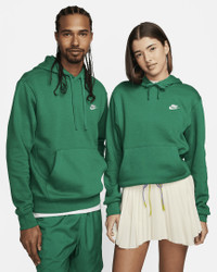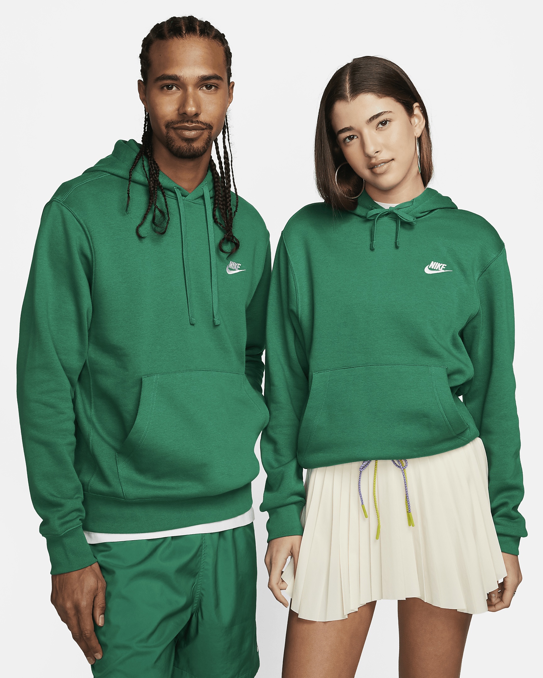 A closet staple, the Nike Sportswear Club Fleece Pullover Hoodie combines classic style with the soft comfort of fleece. Product Details - Standard fit for a relaxed, easy feel - Ribbed hem and cuffs - Kangaroo pocket - Fabric: Body: 80-82% cotton/18-20% polyester. Hood lining: 100% cotton. - Machine wash - Imported - Note: Material percentages may vary depending on factory. Check label for actual content. - Shown: Malachite/Malachite/White - Style: BV2654-365 SIZE & FIT Female is wearing size XS and is 5'11"180cm Male is wearing size M and is 6'2"188cm Standard fit: easy and traditional If you typically wear men's styles, please select your usual size. If you typically wear women's styles, please size down.