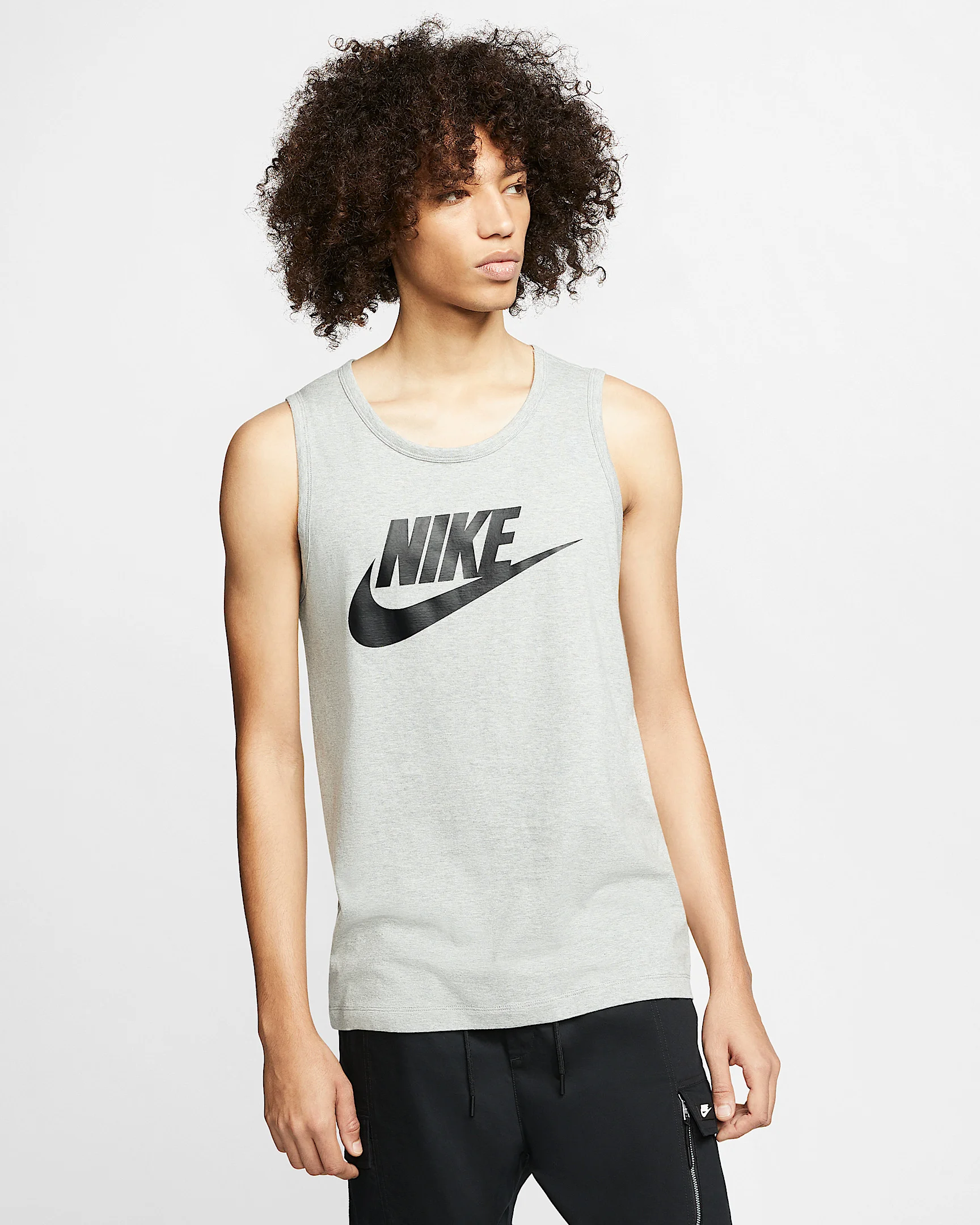 The Nike Sportswear Tank sets you up with a soft cotton jersey feel and bold branding at the chest for warm-weather comfort and style. Product Details - Standard fit for relaxed, easy feel - Fabric: 80-100% cotton/0-20% polyester - Machine wash - Imported - Note: Material percentages may vary depending on color. Check label for actual content. - Shown: Dark Grey Heather/Black - Style: AR4991-063 SIZE & FIT Standard fit: easy and traditional