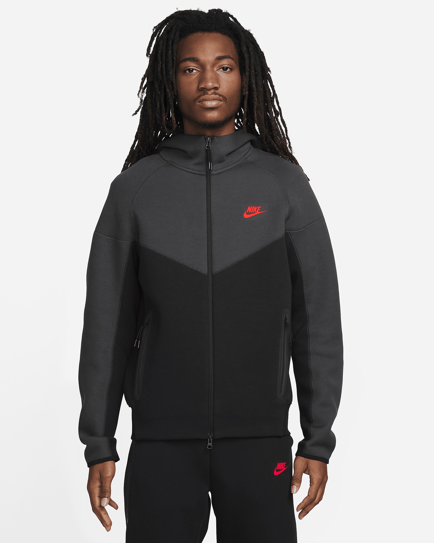Blending 2 of our most iconic looks, this full-zip hoodie draws design inspiration from our timeless Windrunner jacket as well as our Tech Fleece jacket. It's designed to feel relaxed through the shoulders, chest and body for an athletic fit you can layer. Our premium, smooth-on-both-sides fleece feels warmer and softer than ever, while keeping the same lightweight build you love. Benefits - Subtle Windrunner lines nod to the classic running jacket from the late '70s. - Dropped shoulders and paneled sleeve design helps you move with less restriction. - Partial elastic hem helps seal in your warmth and hold the hoodie in place when you move. - Zippered hand pockets feature the signature Tech Fleece taped pocket surround. - Full-zip design with a scuba hood lets you adjust your style and coverage. Product Details - Nike Futura logo at left chest - Body/Hood Lining: 53% cotton/47% polyester. Pocket Bag Knuckle Side: 100% cotton. - Machine wash - Imported - Shown: Black/Dark Smoke Grey/Light Crimson - Style: FB7921-013 SIZE & FIT Model is wearing size M and is 6′0″183cm Big & Tall model is wearing size 2XL and is 6'3"189cm Standard fit: easy and traditional If you typically wear men's styles, please select your usual size. If you typically wear women's styles, please size down.