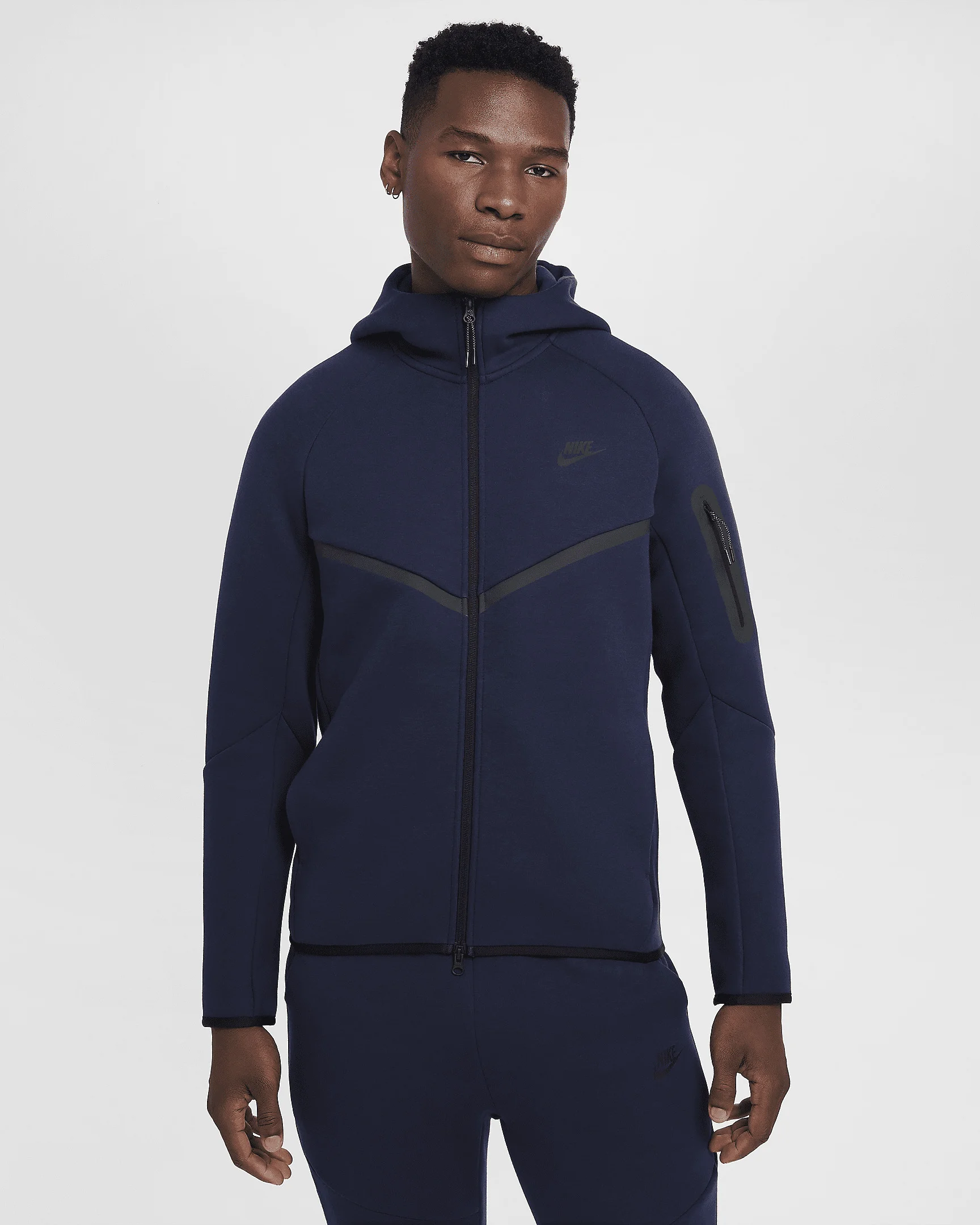 The iconic Tech Fleece Windrunner Hoodie is back. This version has the utility sleeve pocket, hem and cuff binding, and taped chevron that made the original stand out in the streets. Benefits - Our premium, smooth-on-both-sides fleece feels warmer and softer than ever, while keeping the same lightweight build you love. - The standard fit is designed to feel relaxed through the body for easy layering. Product Details - Hand pockets - Zippered sleeve pocket - Body: 53% cotton/47% polyester. Pocket Bag Knuckle Side: 100% cotton. Hood Lining: 53% cotton/47% polyester. - Machine wash - Imported - Shown: Obsidian/Black - Style: HV0949-451 SIZE & FIT Model is wearing size M and is 6′3″191cm Big & Tall model is wearing size 2XL and is 6'3"189cm Standard fit: easy and traditional