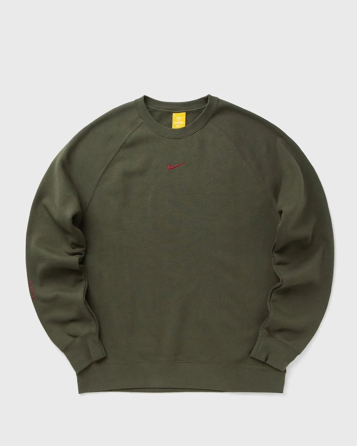 The Nike x NOCTA CS Fleece Crewneck Sweatshirt is made from super-soft fleece with a silicone Swoosh logo and NOCTA branding. - Crew neck - Ribbed cuffs and hem - Silicone Swoosh logo and NOCTA branding Article Number: FN8160-325 Gender: Men Color: CARGO KHAKI/(TEAM RED) Material: 82% Cotton, 18% Polyester
