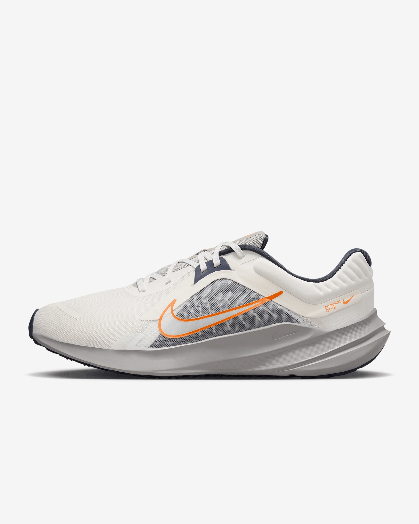 You lace up in pursuit of new personal goals. Let the Nike Quest 5 help you reach those aspirations. This neutral trainer gives you a smooth, comfortable ride with plenty of traction. We focused on our foam, adding more cushioning for a better transition from heel to toe. More Benefits - Supersoft padding and cushioning at the collar help keep your ankle comfortable. - Skins at the toes and eyelets offer durability. Product Details - Shown: Sail/Thunder Blue/Light Iron Ore/Total Orange - Style: DD0204-103