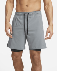 Designed for running, training and yoga, our sweat-wicking Unlimited Shorts were made to do it all. They're here for whatever your workout requires, with a smooth, stretchy outer layer that helps you stay free to move. A tight inner layer adds extra support during your routine. Plus, a hidden pocket lets you keep your phone close as you bring the heat to the gym or a run. More Benefits - Designed for Running, Yoga and Training - Length: 7" - Liner: 2-in-1 - Fabric: 4-way stretch woven - Storage: Side pockets, hidden back pocket and drop-in phone pocket - Waistband: Stay-in-place waistband with convertible interior/exterior drawcord Product Details - Interior key loop - Faux fly - Embroidered Swoosh - Body: 86% polyester/14% spandex. Panels: 89% polyester/11% spandex. Pocket Bags: 100% polyester. - Machine wash - Imported - Shown: Smoke Grey/Dark Smoke Grey/Black/Smoke Grey - Style: DV9334-084 SIZE & FIT Model is wearing size M and is 6'2"188cm Big & Tall model is wearing size 2XL and is 6'0"183cm Standard fit: easy and traditional