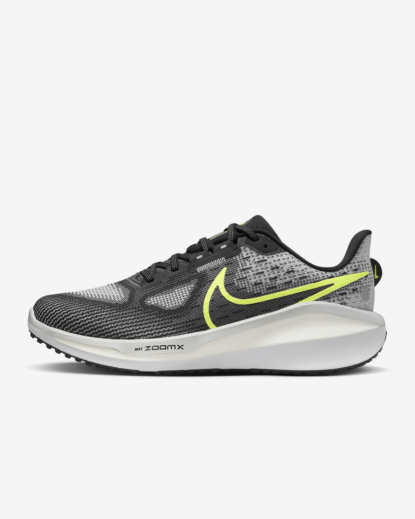 Maximum cushioning provides a comfortable ride for everyday runs. Experience enhanced comfort in this latest version with a dual-density midsole made with a combination of ZoomX underfoot and Cushlon 3.0 foam throughout. Plus, a new engineered mesh upper offers more breathability. Benefits - New engineered mesh upper for soft breathability - Dual-density midsole with ZoomX foam stacked on top of Cushlon 3.0 foam for a comfortable ride - Redesigned waffle-inspired outsole with break points for a smooth, flexible stride - Plush tongue and lining for a comfortably snug feel - What’s New? New stacked foam midsole with premium ZoomX on top of Cushlon 3.0 foam to amplify cushioned comfort. Product Details - Weight: Approx. 298g/ 10.5oz (Men's US 10) - Heel-to-toe drop: 10mm - MR-10 Last - Our best, most consistent fit - Not intended for use as Personal Protective Equipment (PPE) - Shown: Black/Light Smoke Grey/White/Volt - Style: FB1309-001