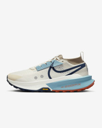 Up the mountain, through the woods, to the top of the trail you can go. Equipped with an ultra-responsive ZoomX foam midsole, the Zegama 2 is designed to conquer steep ridges, jagged rocks and races from trailhead to tip. Optimal cushioning complements a rugged outsole made for your trail running journey. More Benefits - Ankle gaitor helps limit trail debris. - Overlays stretch across the toe for extra durability. Product Details - Weight: Approx. 320 g/11.2 oz (Men's US 10) - Heel-to-toe drop: 4 mm - Reflective details - Not intended for use as Personal Protective Equipment (PPE) - Shown: Phantom/Khaki/Denim Turquoise/Midnight Navy - Style: FD5190-005