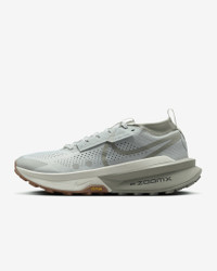 Up the mountain, through the woods, to the top of the trail you can go. Equipped with an ultra-responsive ZoomX foam midsole, the Zegama 2 is designed to conquer steep ridges, jagged rocks and races from trailhead to tip. Optimal cushioning complements a rugged outsole made for your trail running journey. More Benefits - Ankle gaitor helps limit trail debris. - Overlays stretch across the toe for extra durability. Product Details - Weight: Approx. 320 g/11.2 oz (Men's US 10) - Heel-to-toe drop: 4 mm - Reflective details - Not intended for use as Personal Protective Equipment (PPE) - Shown: Light Silver/Sea Glass/Vintage Green/Jade Horizon - Style: FD5190-004