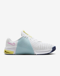 Whatever your "why" is for working out, the Metcon 9 makes it all worth it. We improved on the 8 with a larger Hyperlift plate and added rubber rope wrap. Sworn by some of the greatest athletes in the world, intended for lifters, cross trainers, go-getters and it’s still the gold standard that delivers day after day. More Benefits - Full rubber outsole provides durable traction for dynamic movements like cleans and walking lunges. - Breathable textile has a haptic print, which creates a 3-D effect that adds durability and texture, helping make it easier to keep your shoes clean. Also, it sports flexible, durable support in the toe area, so that when your toes splay when lifting heavy weights, it won’t feel restrictive. Product Details - Shown: White/Deep Royal Blue/Fierce Pink/White - Style: DZ2617-102