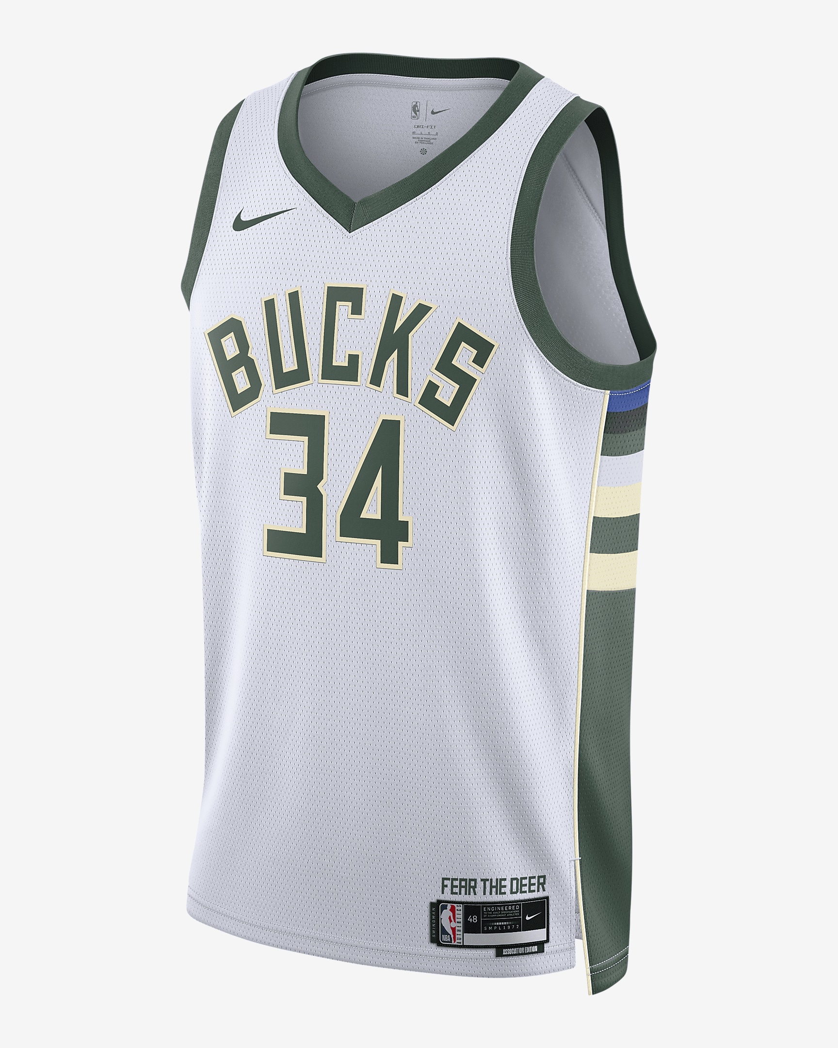 With a white background, the Association Edition Jersey is a common thread shared by every team in the NBA. This Milwaukee Bucks jersey is inspired by what the pros wear on the hardwood, from team colors and graphics to lightweight, sweat-wicking mesh. It helps keep you dry and cool on or off the court while you rep your favorite player and the game you love. Benefits - Nike Dri-FIT technology moves sweat away from your skin for quicker evaporation, helping you stay dry and comfortable. - Breathable mesh helps keep you cool on or off the court. Product Details - Twill player name and number - Heat-applied graphics - Jock tag at hem - 100% polyester - Machine wash - Imported - Shown: White - Style: DN2084-100 SIZE & FIT Standard fit: easy and traditional If you typically wear men's styles, please select your usual size. If you typically wear women's styles, please size down.