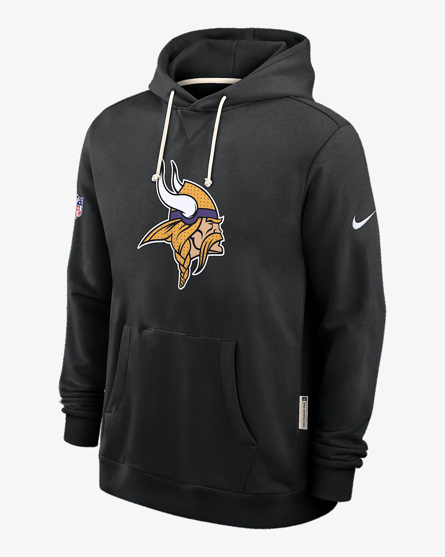 Featuring bold team graphics, the Initial Home Sideline Hoodie combines sweat-wicking technology with a soft fleece lining to help you comfortably support the Minnesota Vikings in cooler weather. Benefits - Nike Dri-FIT technology moves sweat away from your skin for quicker evaporation, helping you stay dry and comfortable. - Dolman sleeves help increase range of motion with a roomy fit under the arms. Product Details - Hood with drawstring - Front pocket - Zippered pocket at right side - 53% polyester/47% cotton - Machine wash - Imported - Shown: Black - Style: 03AZ00A9M-A0M