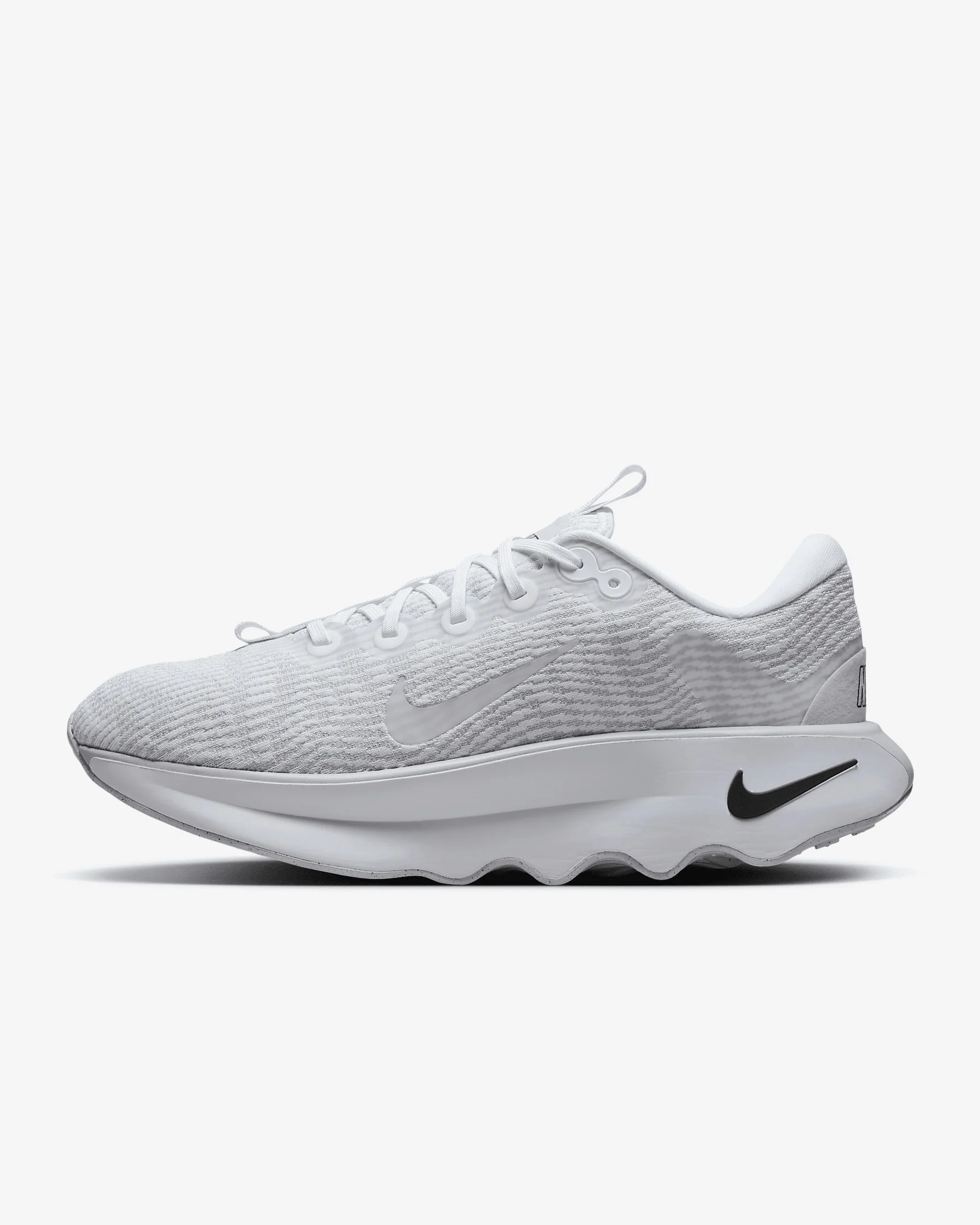 Designed for walking in ultimate comfort, the Nike Motiva provides our highest level of cushioning. A tall foam stack combines with our Comfortgroove innovation on the outsole to absorb the bumps along the way. And its exaggerated rocker helps propel you forward. Benefits - Super-high cushioning - Moderate stability - Moderate flexibility Product Details - Soft foam collar - Widened forefoot, arch and toe box - Durable outsole pattern for traction - Shown: White/Black/Pure Platinum/White - Style: DV1237-102