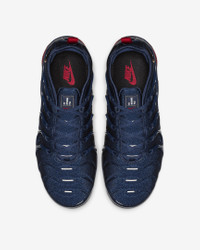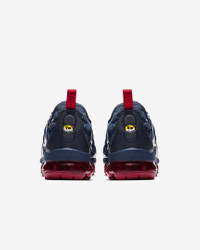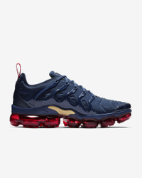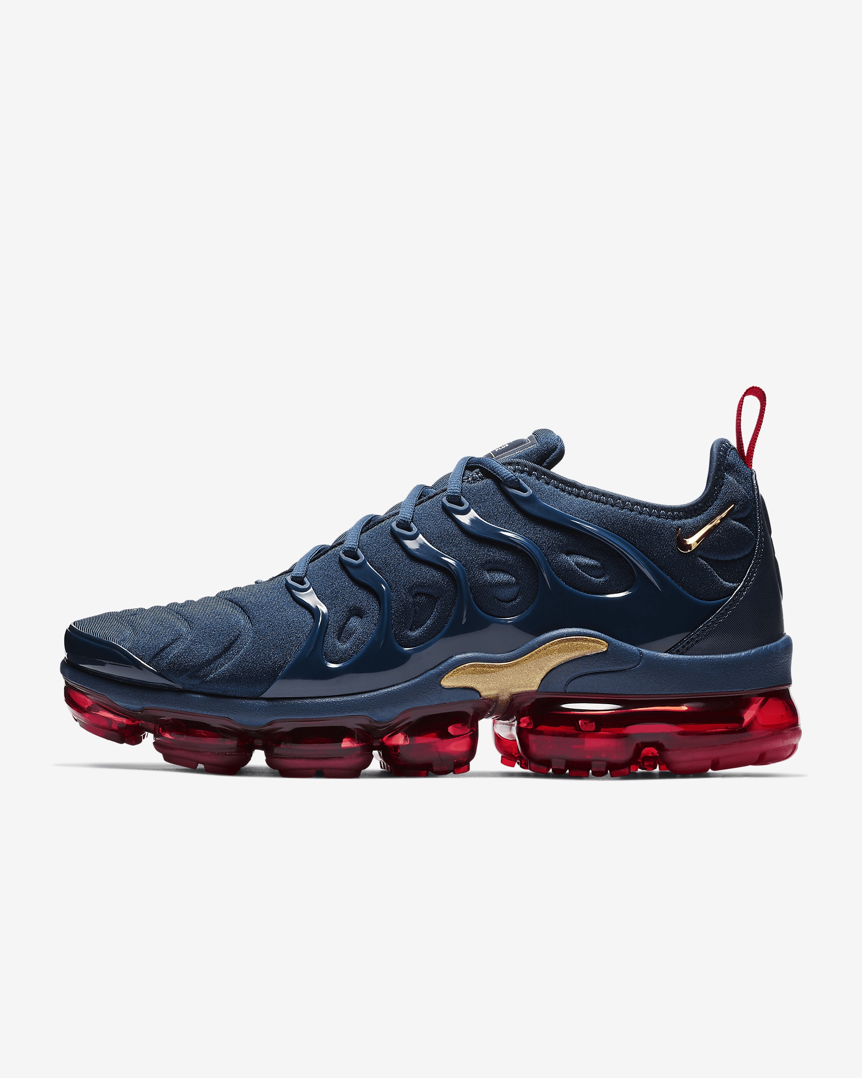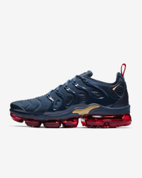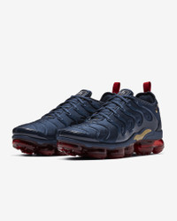 The Nike Air VaporMax Plus looks to the past and propels you into the future. Nodding to the 1998 Air Max Plus with its floating cage, padded upper and heel logo, it adds revolutionary VaporMax Air technology to ramp up the comfort and create a modern look. Benefits - Bringing beach life to the city, the prominent arch draws inspiration from a whale's tail and adds structure while the iconic wavy fingers nod to palm trees and ocean waves. - Originally designed for performance running, Nike Air units provide lightweight cushioning that lasts. - Bold, gradient colors add heritage style to this powerhouse Air Max. - Synthetic upper adds lightweight comfort and durability. - Full-length rubber outsole adds traction and durability to your journey. Product Details - Pull tab - Reflective details - Not intended for use as Personal Protective Equipment (PPE) - Shown: Midnight Navy/Black/University Red/Metallic Gold - Style: 924453-405