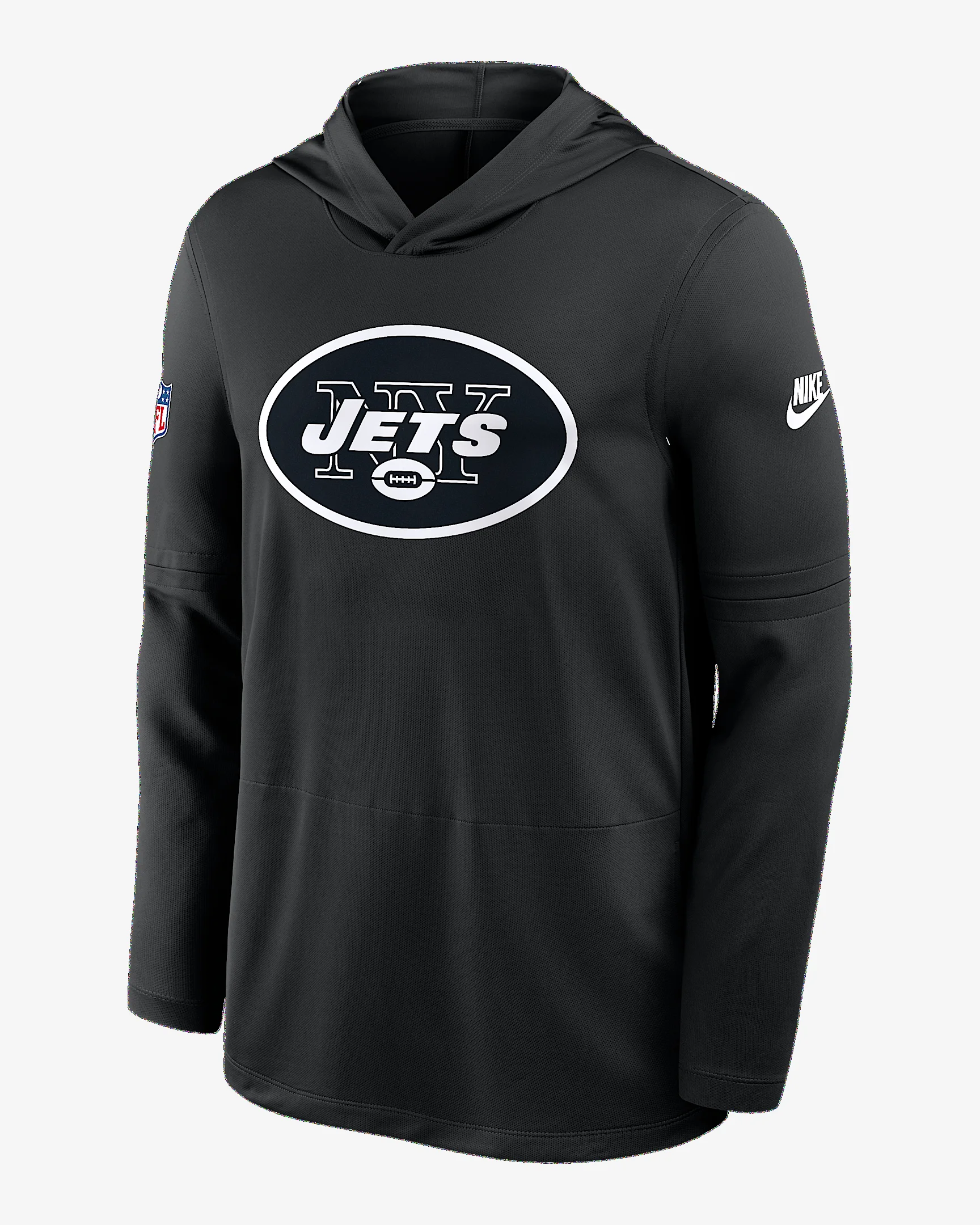 Perfect for lightweight coverage, the Pass Accuracy Top helps you comfortably support the New York Jets. It features sweat-wicking technology for ultimate comfort. Benefits - Nike Dri-FIT technology moves sweat away from your skin for quicker evaporation, helping you stay dry and comfortable. - Rounded drop-tail hem helps provide proper coverage. Product Details - Hood without drawstring - 100% recycled polyester - Machine wash - Imported - Shown: Black - Style: 03B900AQ9Z-D60